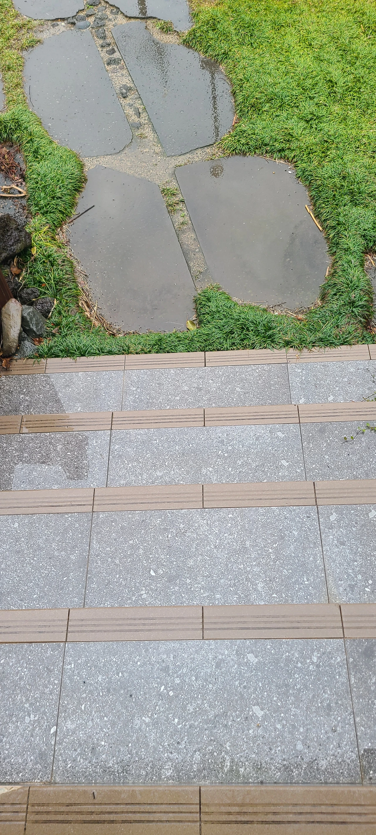 비를 맞아 촉촉해진 계단과 의자, 그리고 애란들