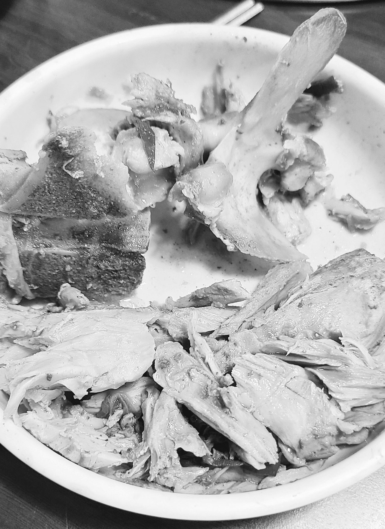 그런데도 세 남자는 말없이 쪽쪽 소리를 내며 앙상한 뼈들만 붙잡고 있었다. 급기야는 내가 좋아하는 순 살코기는 그릇에 다 빼 버리고, 뼈다귀만 먹기 시작했다.