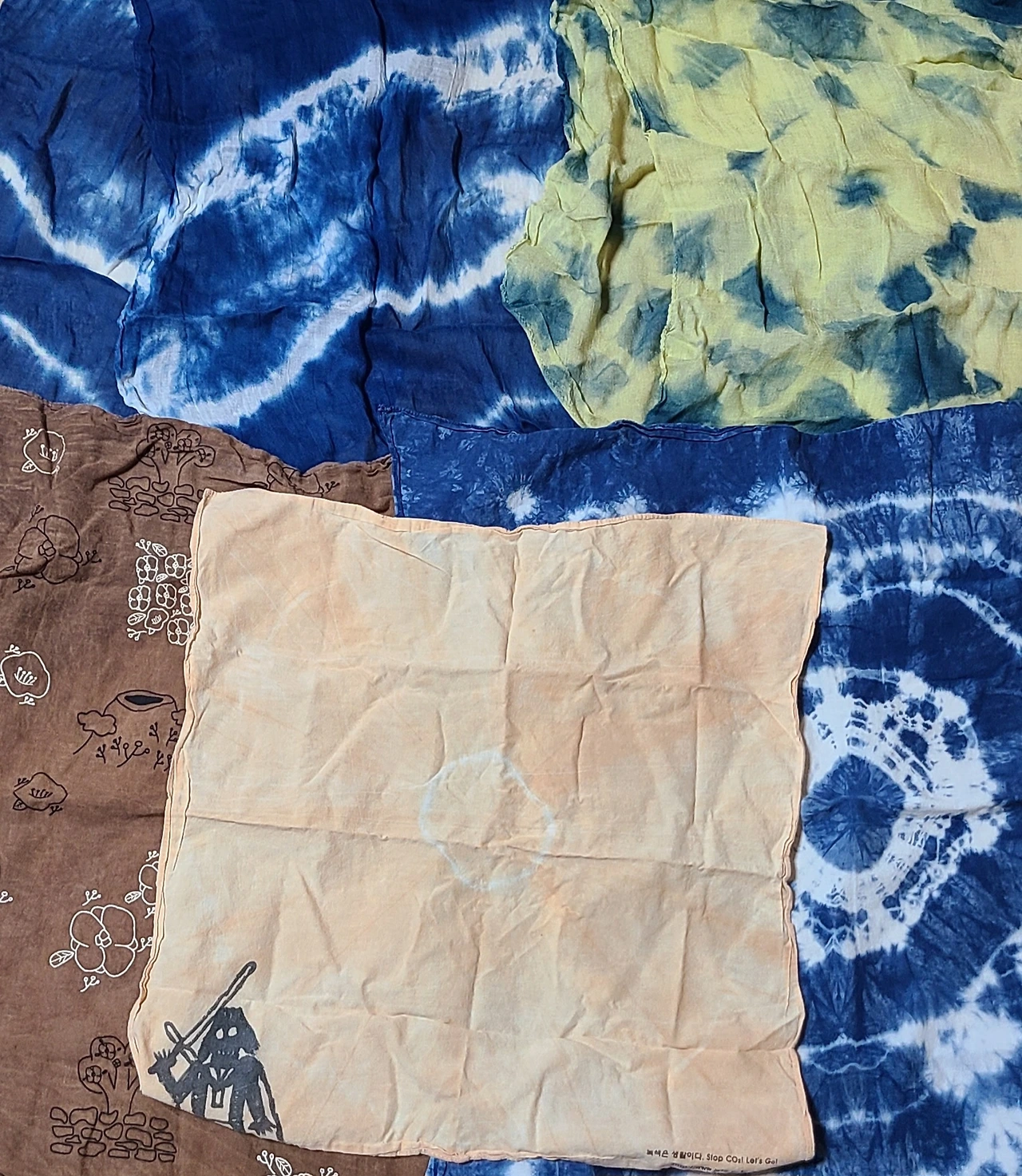 두 아이가 학교나 외부에서 염색활동을 종종 하는데, 대부분 손수건에 감물이나 쪽물을 염색한다. 색도 다르고 모양도 다양하고. 염색한 손수건은 빨수록 색이 바래지면서 생기는 운치가 있다. 엄마를 향한 아이들의 귀여운 마음까지 덤으로 따라오니 두 아이의 염색 손수건 선물이 나는 그렇게나 좋다.