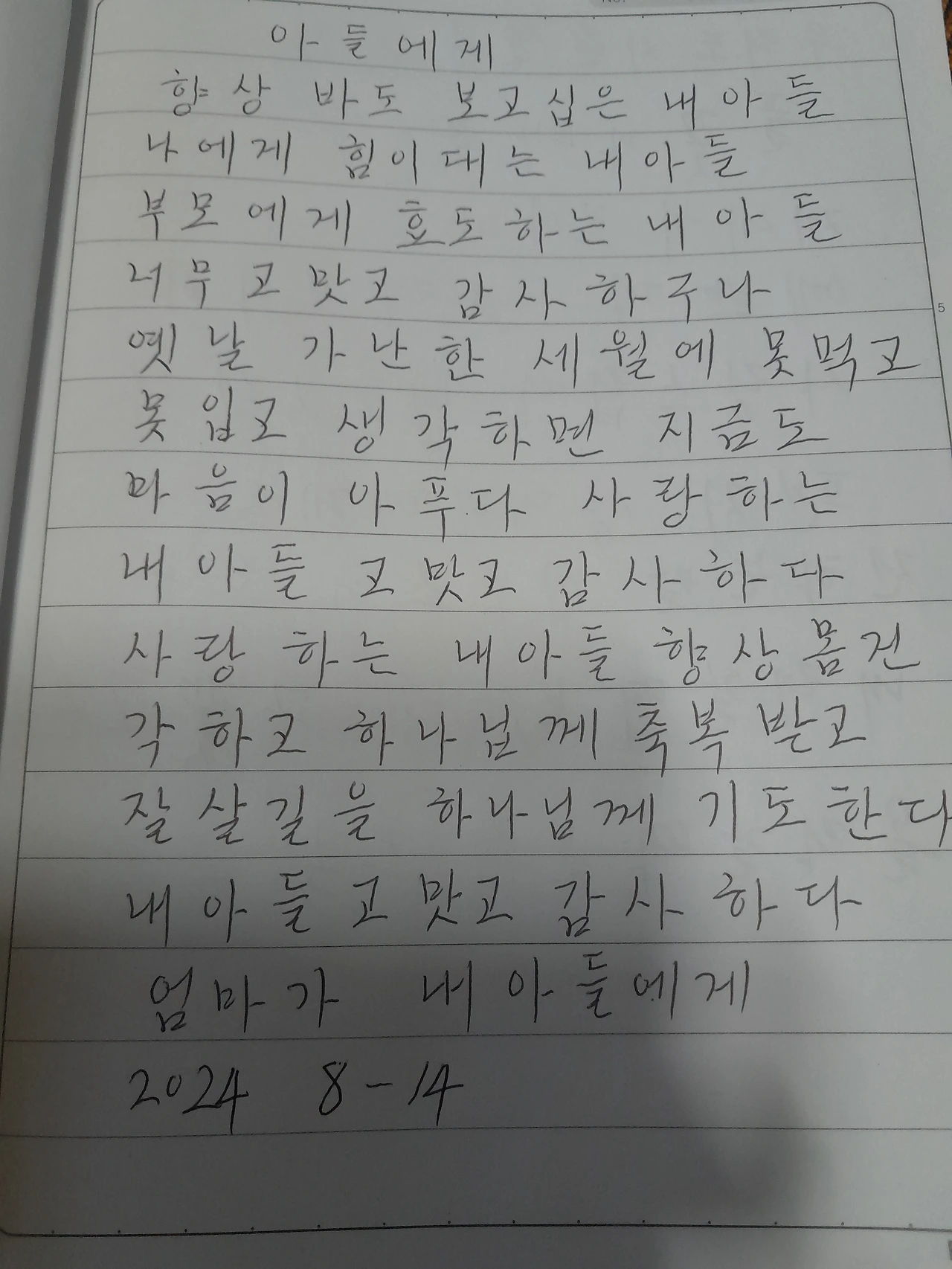어머니가 노인복지관에서 시 쓰기 수업을 받는다고했다. 첫 수업시간에 선생님이 가족을 생각하며 시를 써보라고 했는데, 어머니는 나를 생각하며 시를 썼다며 공책에 쓴 시를 자랑하듯 보여줬다. 공책 한 페이지를 가득 채운 시였지만 글씨가 컸기 때문에 내용은 많지 않았다.