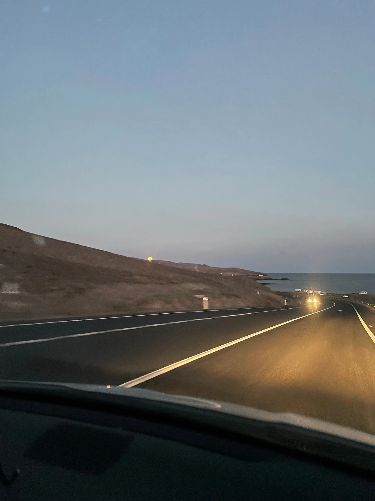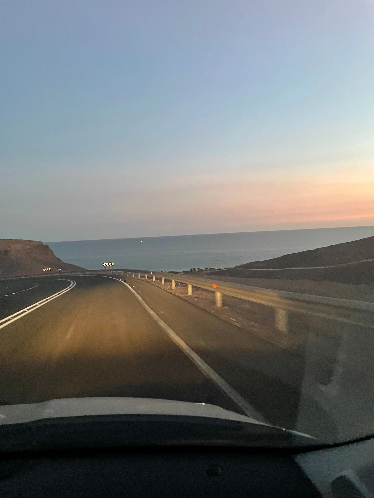 푸에르트벤투라의 고속도로에는 가로등이 별로 없어서 밤에는 앞이 잘 안 보인다. 깜깜해서 사고 날 위험이 있기 때문에 속도를 낼 수가 없었다. 앞이 너무 안 보여 때로는 언덕의 내리막길을 가기 진적에는 눈앞에 큰 바다만 보여서 우리 차가 바다로 달려드는 기분이 들 때도 있었다.