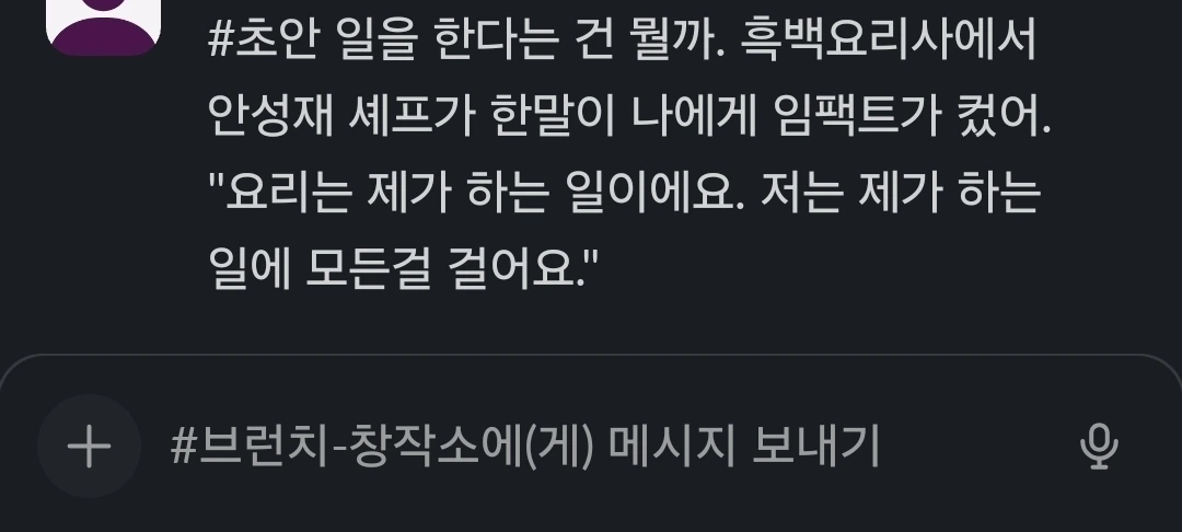 결국, 일을 한다는 것은 내가 누구인지, 무엇을 위해 살아가는지를 묻는 물음과 다르지 않다. 나는 오늘도 그 답을 찾기 위해 일을 한다. 그리고 언젠가, 나도 안성재 셰프처럼 내가 하는 일에 모든 것을 걸 수 있는 날이 오기를 기대한다. 그날이 오면, 나는 비로소 내가 무슨 일을 하고 있는지를 진정으로 알게 될 것이다.