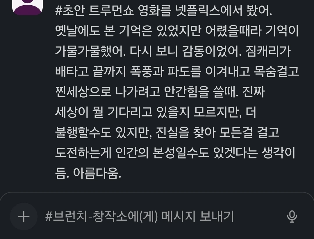 어느 늦은 저녁, 나는 다시 한번 '트루먼 쇼'를 넷플릭스에서 틀었다. 어릴 적 그저 재미있는 영화로만 기억되었던 작품이었지만, 이제는 그 속에 담긴 메시지가 묵직한 울림으로 다가왔다.