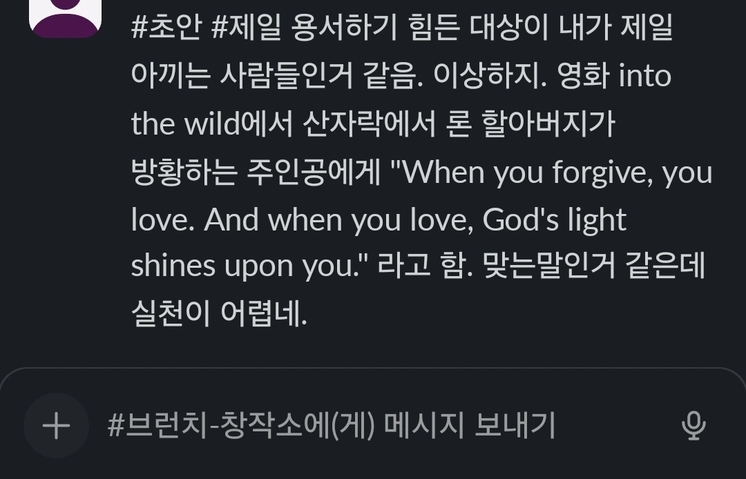 제일 용서하기 힘든 대상이 내가 제일 아끼는 사람들인 것 같다. 참 이상한 일이다. 사람은 누구나 실수를 하고, 그 실수는 때때로 사랑하는 이들에게 상처를 남기곤 한다. 그런데 그 상처가 깊을수록, 아이러니하게도 우리는 더 쉽게 용서를 미루게 된다. 그럼에도 불구하고, 용서는 결국 우리 자신을 위한 것임을 깨닫는다. 영화 *Into the Wild*의 한 장면이 떠오른다. 산자락 아래서 론 할아버지가 방황하는 주인공에게 말한다. "When you forgive, you love. And when you love, God's light shines upon you." 그 말이 맞는 것 같다. 용서가 사랑과 연결된다는 것은 어쩌면 당연한 일이다. 하지만 그 당연함을 실천하는 것은 얼마나 어려운가.