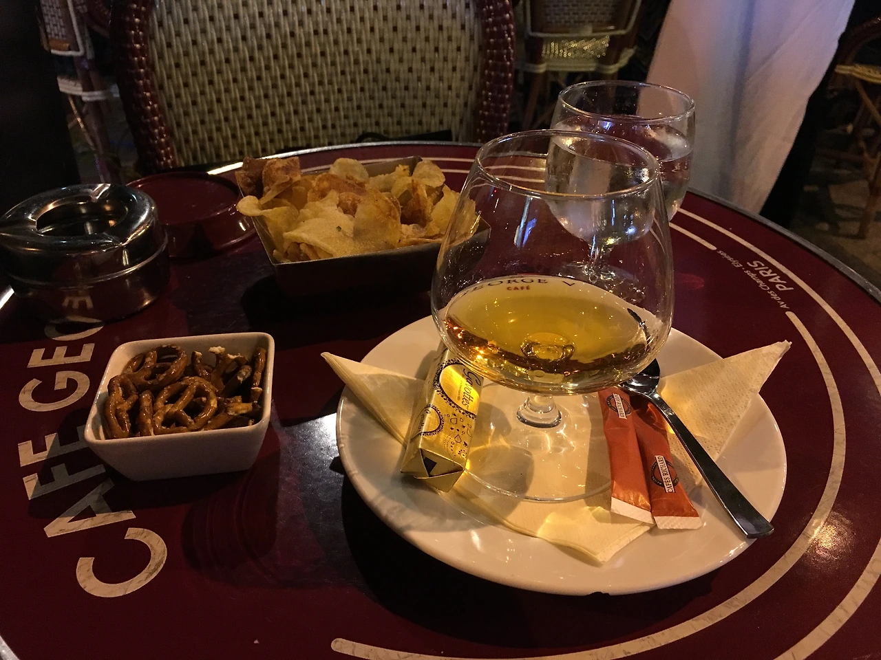 쟁반을 들고 온 종업원이 작은 원형의 테이블에 간단한 스낵과 둥근 유리잔에 담긴 깔바도스를 올려놓고 흰색 접시 위에 두 개의 각설탕과 스푼을 세팅해 주었다. 까끌거리는 질감의 라탄의자에 몸을 기대고 깔바도스를 마시며 어둠에 잠긴 거리를 바라봤다. 눈앞에는 아치형 모양을 한 회색빛의 개선문이 빛나고 있었다.