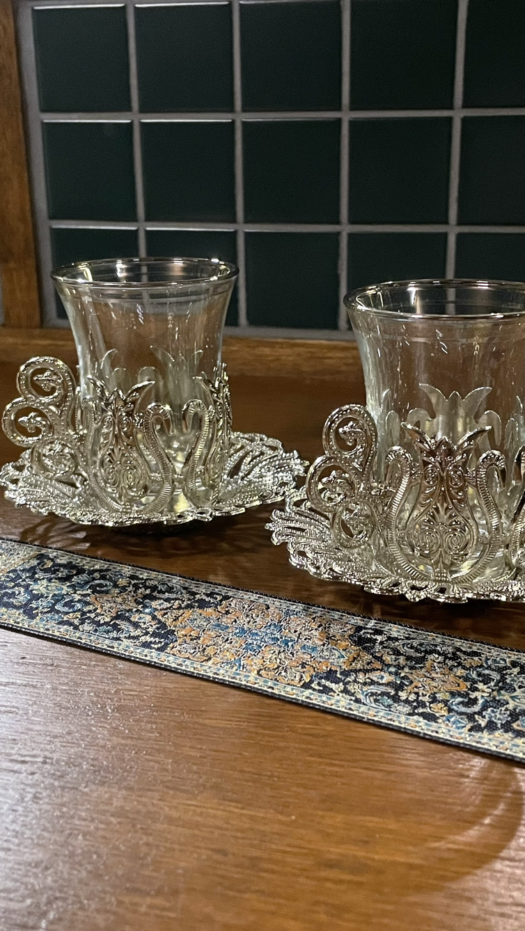 찻잔 받침과 찻잔의 아랫부분에는 터키의 국화인 튤립을 형상화한 기하학적 문양이 장식되어 있고 안에는 마찬가지로 튤립 형태를 띤 유리잔으로 어우러져 있다. 화려한 금속 장식과 매끄러운 유리의 질감이 독특하고 이국적인 감상을 자아낸다.