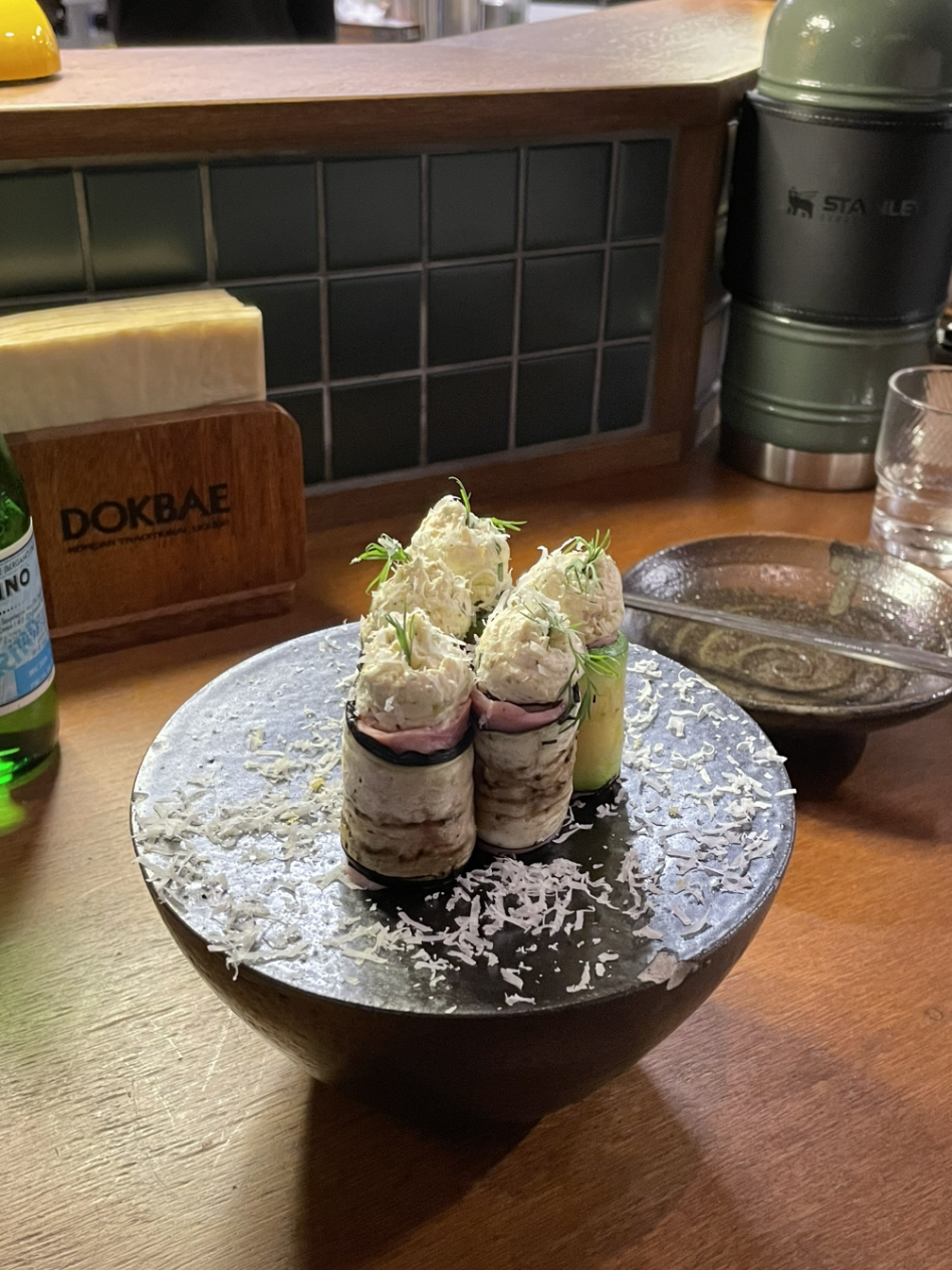 석쇠에 구워져 동그란 모양으로 말린 애호박과 가지 안에는 베이컨, 크림치즈와 차이브가 들어있다. 애호박롤을 집어 한입 베어 먹자 부드러운 식감과 짭조름한 베이컨, 치즈크림과 차이브의 다채로운 식감이 입안에 머문다. 조심스레 음미한 후 향긋한 송이주를 한 입 들이켠다. 근래 경험해 본 식당 중 가장 만족스러운 경험이다. 감탄스러운 한숨을 내쉰 S가 말했다.