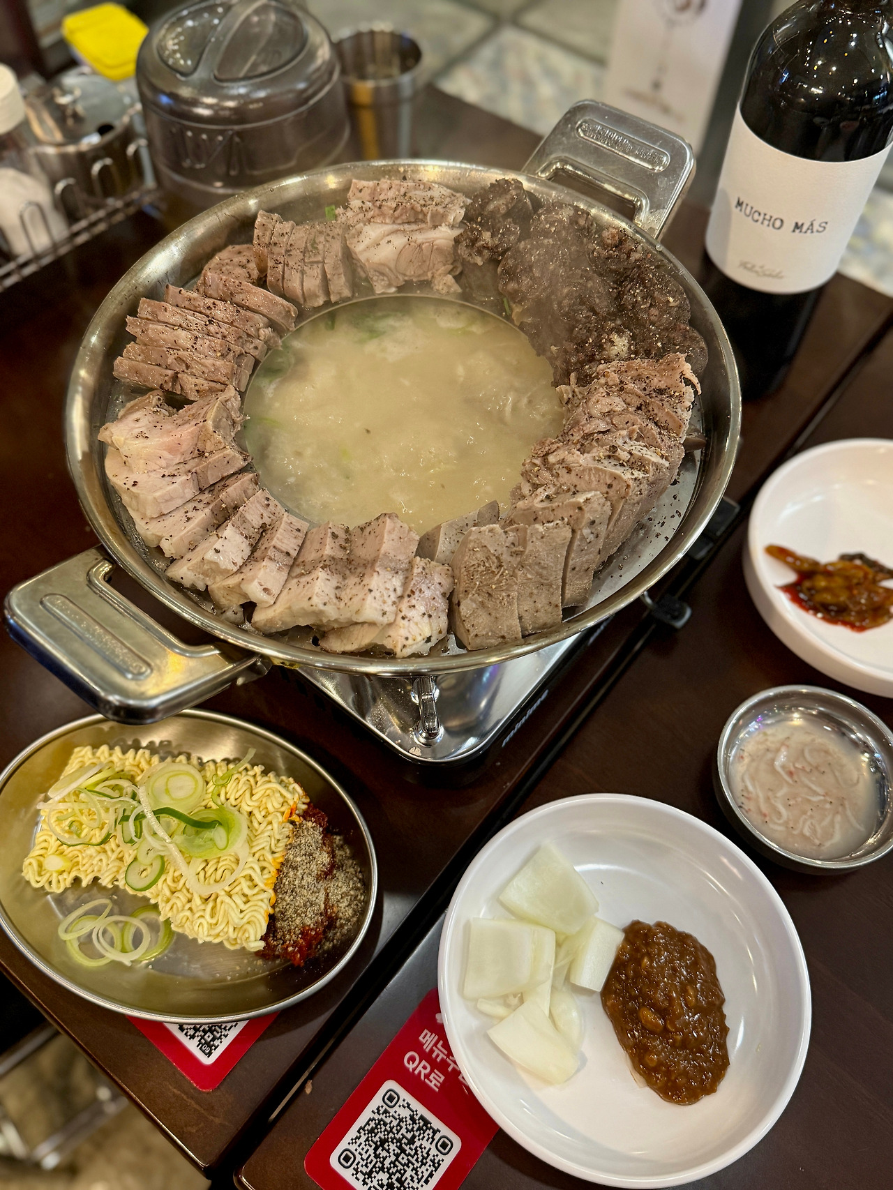 잠깐의 협의 후에 수육모듬전골을 주문했다. 사장님이 둥근 전골냄비를 테이블 위에 세팅해 주었다. 뚜껑을 열자 한눈에 보기에도 진해보이는 뽀얀 육수가 끓고 있고 도넛모양의 채반 위에는 순대, 여러 부위의 수육이 정갈히 자리 잡고 있다.