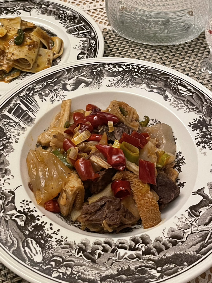 우삼보에는 업진살, 도가니, 깐양, 대파, 건고추가 들어있다. 첫 입은 업진살. 기름진 육즙과 불향이 어우러져 씹을수록 감칠맛이 진하게 번진다. 도가니는 젤라틴 특유의 미끄러움과 진득한 감촉이 입안을 가득 채운다. 고추기름에 절여진 풍미와 순식간에 녹아버려 입안에 들러붙는 부드러움이 깊은 맛의 층을 이룬다. 소의 위 부분인 깐양은 업진살과 도가니와 대조되는 쫄깃한 식감이다. 씹을수록 풍미가 농축되고 묵진한 잔향이 혀끝에 남는다. 같이 볶아진 대파와 건고추가 존재감을 잃지 않고 감칠맛을 더해준다.