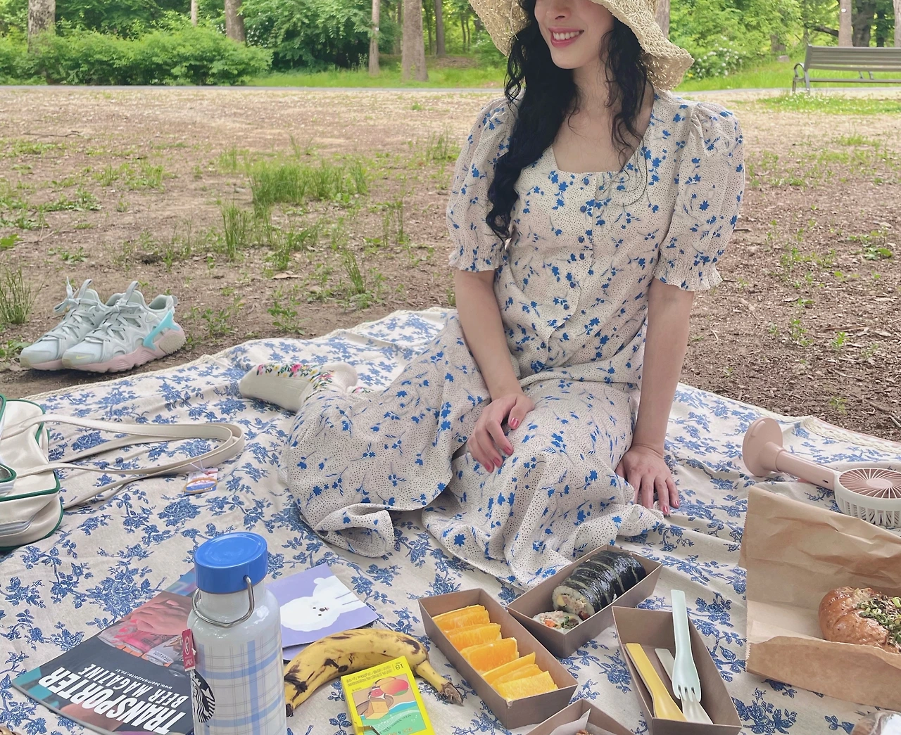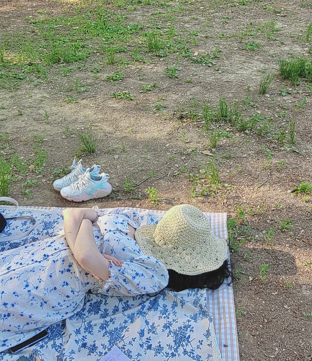 파란 꽃무늬가 있는 흰색 원피스. 집을 나설 때는 별 생각이 없었는데, 돗자리와 똑같은 무늬다.