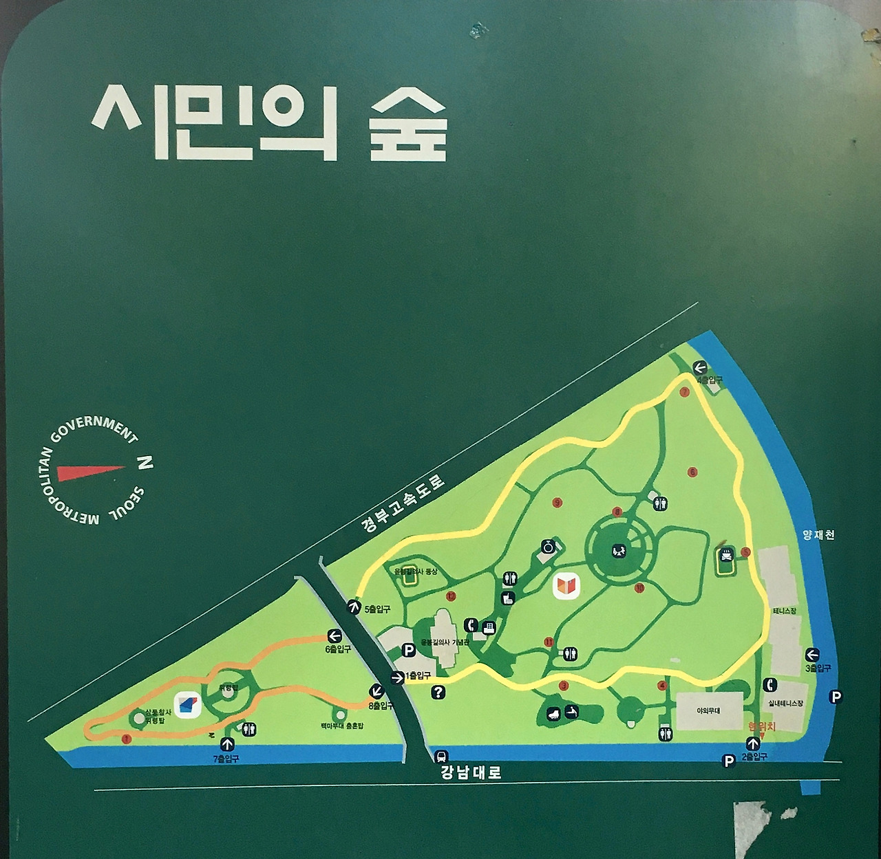 양재 시민의 숲. 나는 이곳을 피자숲이라 부른다. 공원 입구에 있는 지도 팻말 때문이다. 공원의 모양은 조각난 피자와 정확히 닮아있다.