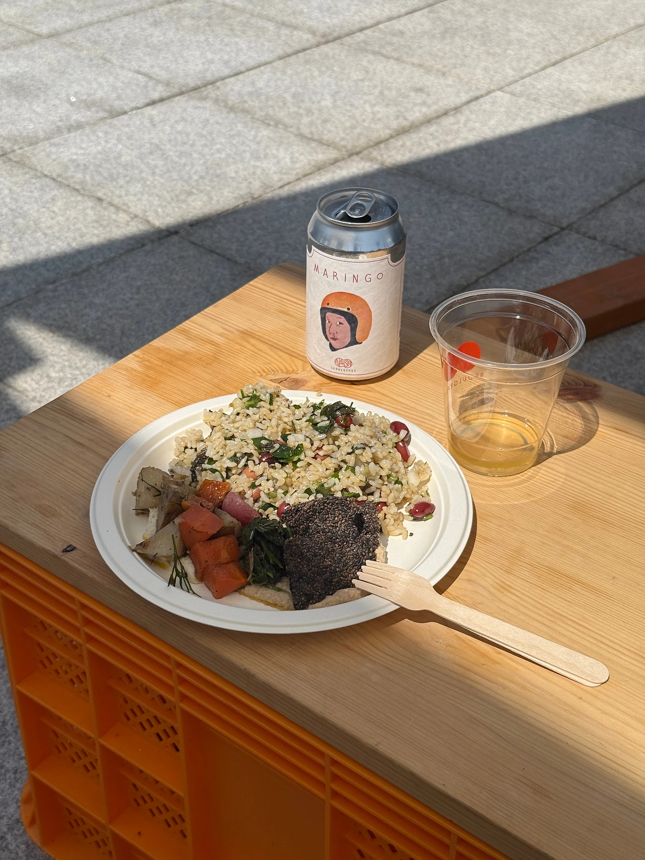 나물 플레터 옆에 놓인 미색 종이질감의 맥주캔을 집어 들었다. 주황색 헬멧을 쓴 캐릭터가 그려져 있는 군더더기 없는 디자인이 시선을 잡는다.