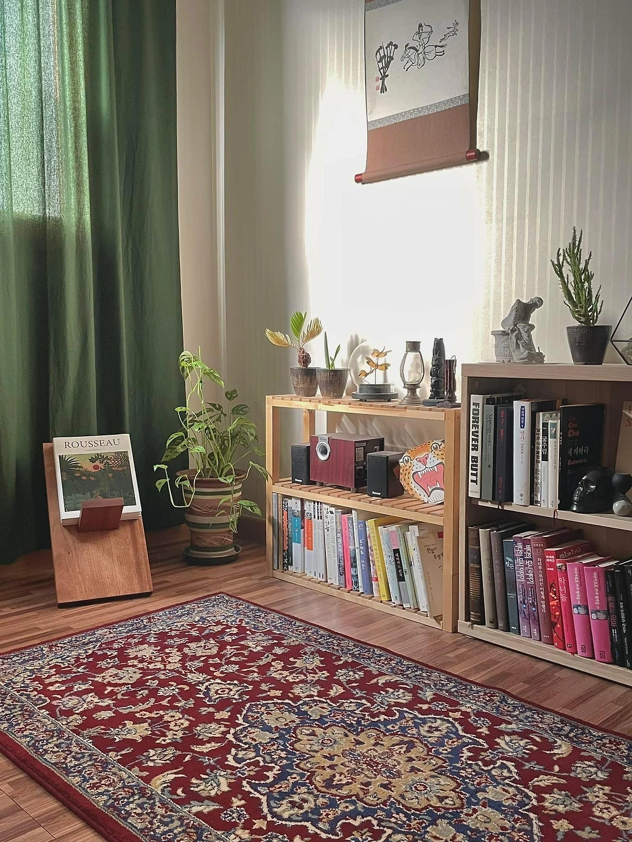 모아둔 책들을 선반에 정리하고 유리진열대에는 모아둔 위스키들과 파리에서 구입해 온 깔바도스 2병을 넣어두었다. 꽉 찬 선반에서 밀려나 바닥에 쌓여있는 책들 옆에는 린넨으로 된 초록색 커튼이 늘어져 있다. 코너에는 몬스테라 화분을 놓아두고 책장 맞은편에 있는 테이블 아래에는 오리엔탈 문양의 붉은 카펫을 깔았다. 장스탠드가 방안 가득 안온한 온기를 뿌렸다.