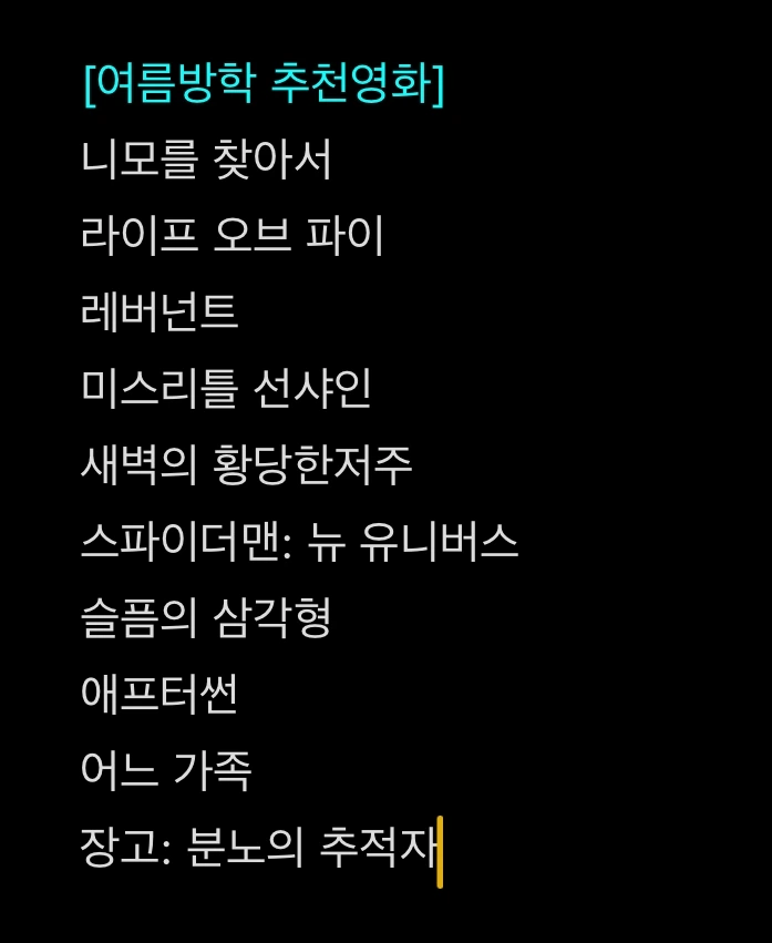 이때 가장 좋은 방법은 신뢰하는 사람에게 추천을 받는 거다. 내 경우엔 나보다 영화를 더 좋아하는 남자친구가 있다. 리틀 이동진인 그에게 여름방학 영화를 추천하라고 부탁했다. 영화광답게 그는 바쁜 와중에도 리스트를 뚝딱 만들어주었다. 무려 10가지나.