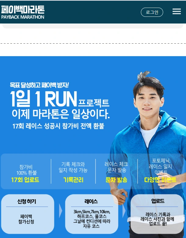 미뤄뒀던 페이백 마라톤을 5만 원 주고 신청했다. 한 달간 17회 이상 달리고 기록을 올려야 한다. 최소 3km부터 풀코스까지 거리도 다양하게 원하는 만큼 실천하면 된다. 완주(17회 이상)했을 땐 럭키 박스(작은 선물)와 신청했던 돈을 돌려받는다. 달릴 수밖에 없는 조건을 만들었고 실행에 옮겼다.