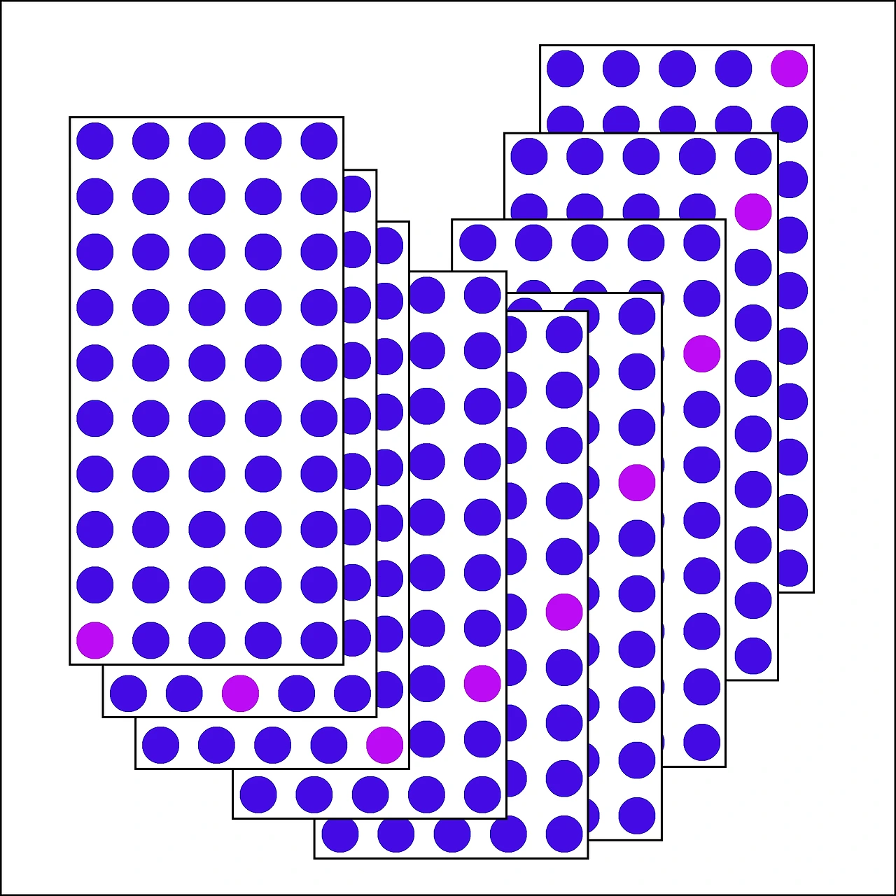 인간이 색깔을 보는 것이 얼마나 신비로운지 알아보기 위해서 인간과 비슷한 휴먼로봇을 예로 들어보자. 로봇은 광학적인 눈, 즉 스마트폰의 렌즈와 같은 눈을 사용해서 색깔들을 구별할 수 있다. 아니 구별하는 것처럼 보인다. 각 색깔에서 반사된 전자기파의 파장을 분석해서 색깔의 미묘한 차이도 알아낼 수 있다. 아마도 인간의 눈보다 그 기능이 뛰 어날지도 모른다. 그러나 그 기능은 제쳐두고 로봇이 색깔을 볼 수 있는지 알아보자. 달리 말하면 인간이 색깔을 느끼듯이 로봇도 색을 느낄 수 있는가 하는 것이다. 그림 2는 9장의 카드로 각 장에는 50개의 보라색의 점들이 있고 한 점만 색조가 다르다. 약간 밝은 색조의 보라색 점을 각 장마다 위치를 달리해 놓았다.