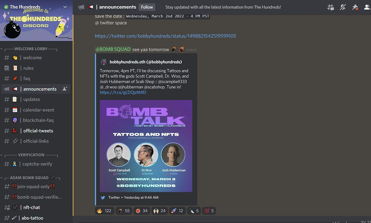 NFT 프로젝트팀 혹은 작가는 트위터와 디스코드를 통해 수집가들과 소통하고 특히 디스코드는 수집가들끼리도 커뮤니티를 구성하여 활발하게 소통합니다. 일종의 팬카페와 유사하다고 생각하면 될 것 같습니다. 디스코드 서버 내에서 소유자들이나 관심있는 사람들을 위해 다양한 이벤트도 진행하며 소유자들끼리 NFT 가격, 음악, 스포츠 등 다양한 주제를 갖고 대화도 합니다. NFT 프로젝트에게 디스코드는 프로젝트의 방향성을 제시하고 새로운 소식을 알리고 소유자 혹은 관심자들을 관리하는 필수적인 공간이 되었습니다. 그리고 개인 크리에이터들도 커뮤니티 공간을 만들어 수집가와 소통하고 있습니다. 뿐만 아니라 NFT 관련 플랫폼들 또한 대부분 디스코드를 운영하고 있습니다.