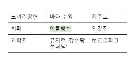 ‘여름방학’을 가지고 제가 해볼게요. 먼저 가장 가운데 ‘여름방학’을 씁니다. 그리고 여름방학과 관련해서 떠오르는 걸 나머지 빈 칸에 써보는 거에요. 양육자라면, 아이가 힘들어 할 때 힌트를 주세요. “여름방학 때 했던 일을 떠올려봐” 이런 식으로요.
