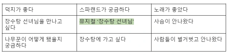 먼저 가장 가운데 소재(뮤지컬 장수탕 선녀님)을 씁니다. 그리고 느낀 점이나 인상적이었던 걸 쓰게 합니다. 이때 주의할 점은 ‘재미있었다’ ‘신기했다’ 같은 추상적인 평가를 쓰게 하지 않는 겁니다. 그렇게 쓰면 “왜 재밌었어?” 하고 물어보고, 그 포인트를 쓰게 하세요.