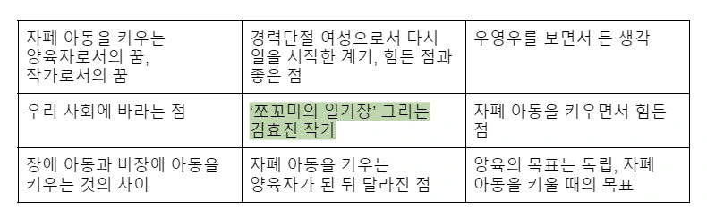 저는 이 중에서 ‘자폐 아동을 키우는 양육자’를 만나야겠다고 생각했고, 마침 트위터 타임라인(저는 트위터 애호가입니다!)에서 김효진 작가님의 웹툰이 리트윗 되어 왔던 기억을 떠올렸죠. 이제 구체적이고 실질적이면서도 핫한 소재를 찾는 방법, 확실히 아시겠죠?