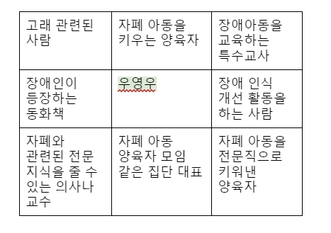 이번엔 어른의 글을 예로 들어볼게요. 저는 주로 인터뷰를 하잖아요. 가장 최근에 인터뷰는 자폐스펙트럼 장애를 가진 아이를 키우는 이야기를 웹툰으로 그리고 있는 김효진 작가 인터뷰였는데요. 김효진 작가님을 찾을 때 이런 식의 만다라트를 그렸어요(물론 저는 실제로 그리진 않았습니다. 머릿 속에서 그릴 만큼 익숙해졌거든요). 시작은 드라마 ‘이상한 변호사 우영우’였습니다. 참고로 저는 현재 밀레니얼 양육자를 타겟으로 콘텐츠를 생산하는 ‘hello! Parents’라는 팀에서 일합니다. 양육자라는 타겟이 좋아할만한 걸 중심으로 소재를 찾는다는 걸 미리 말씀드려요.