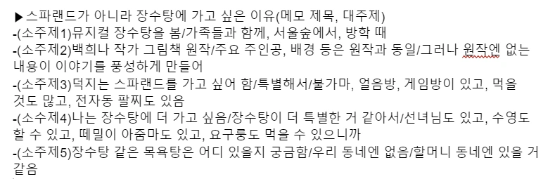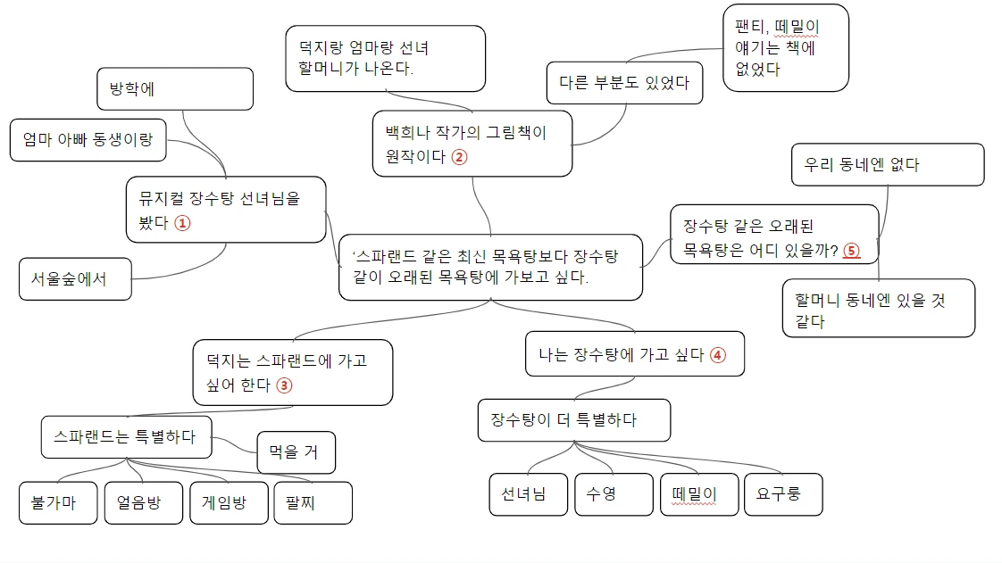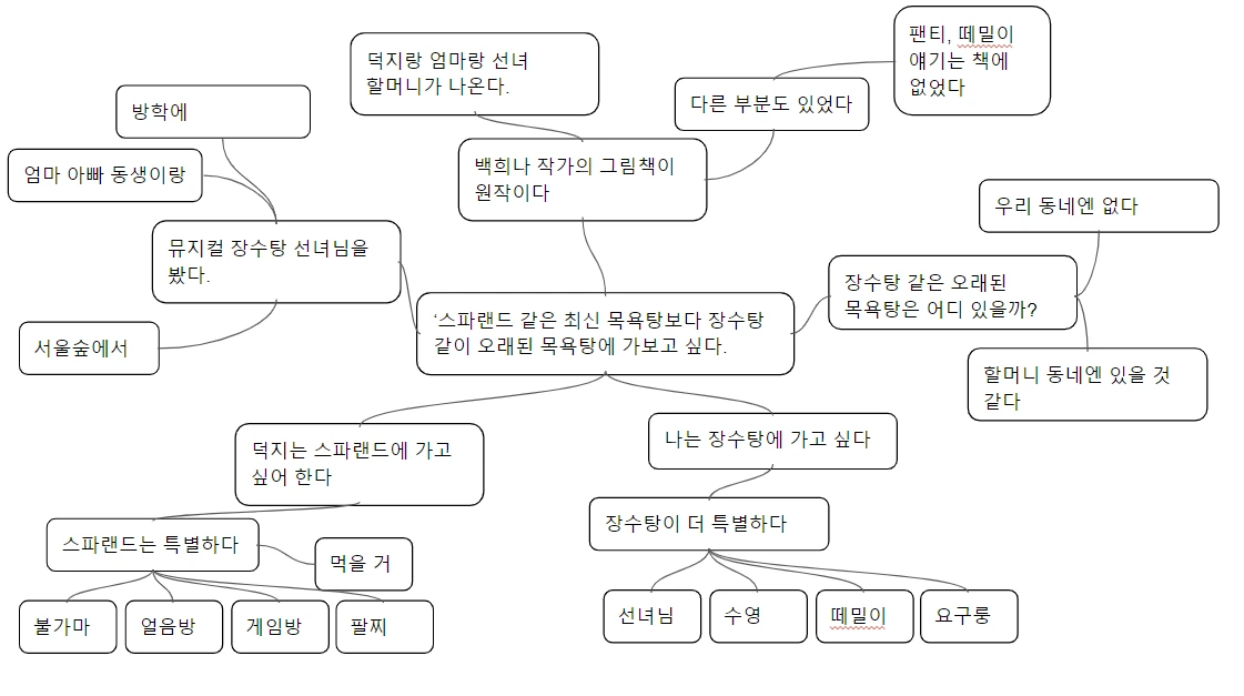이제 이 중에 하나를 고릅니다. 저는 이걸 골라봤어요. ‘스파랜드 같은 최신 목욕탕보다 장수탕 같이 오래된 목욕탕에 가보고 싶다.’ 자, 이제 이걸로 구성하는 법을 알려드릴게요. 마인드맵 중심에 주제를 씁니다. 그리고 그 주제에서 가지를 쳐요. 가지 숫자는 여러분 마음에 달렸습니다. 가지가 3개일 수도 있고, 5개일 수도 있어요. 각 가지에는 관련해서 여러분이 쓰고 싶은 말을 모두 써넣습니다. 이런 식으로요.