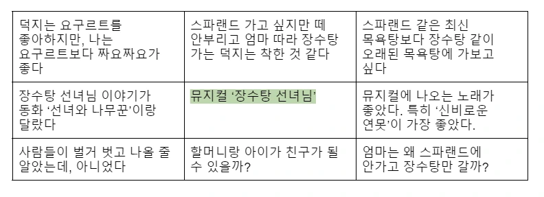 제가 추천해드리는 방법은 마인드맵입니다. 예를 들어 설명해보겠습니다. 2편에서 뮤지컬 ‘장수탕 선녀님’이란 소재를 가지고 주제 찾기를 했던 만다라트, 기억나시죠? 복습하는 기분으로 먼저 만타라트를 활용해 ‘장수탕 선녀님’에서 주제를 찾아보겠습니다. 그리고 거기서 찾은 주제를 중심으로, 마인드맵을 활용해 글을 구성해볼게요.