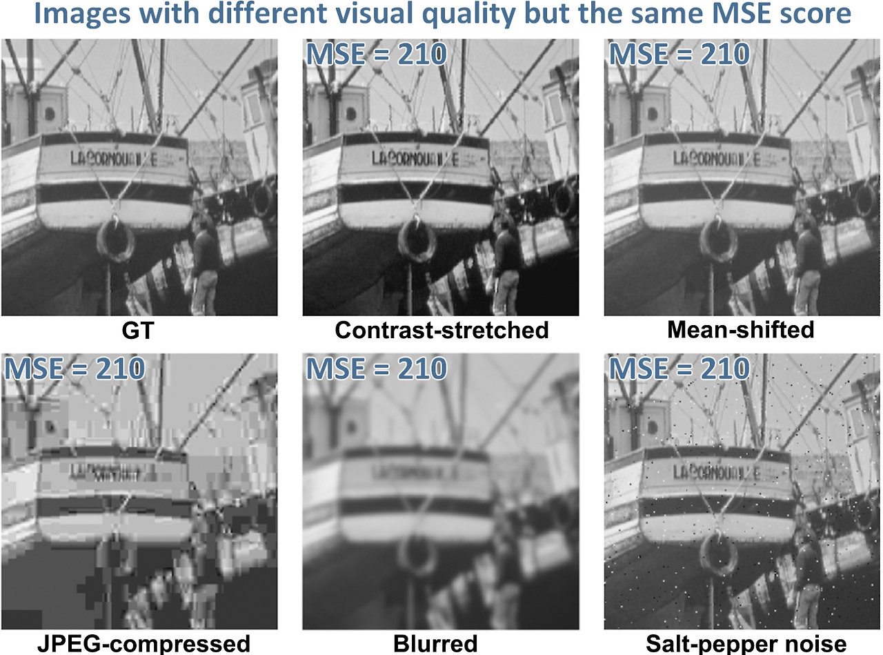 GT는 원본 사진이며 나머지 다섯 장은 모두 원본을 변형한 사진이다. 다섯 개 변형본들은 모두 같은 PSNR값을 가진다. PSNR값이 다 같다고 하기에 사람이 인식하는 다섯 개 변형본들의 화질은 놀라우리만치 다르다. 원본보다 나은 변형본도 있고 원본보다 훨씬 못한 변형본도 있다.