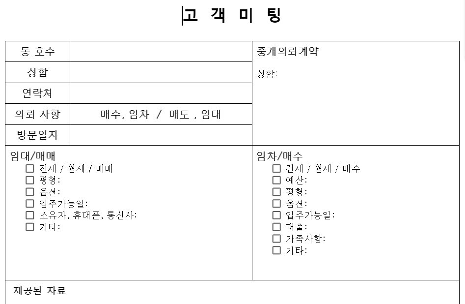 ‘고객 미팅’ 카드를 미리 준비해 두자. 카드는 꼭 기록해야 하는 필수 항목을 리스트로 해서 고객에게 질문을 하는 양식이다. 상담 카드를 프린트해 두었다가 손님의 전화, 방문 상담 시에 즉각 활용할 수 있도록 하자. 상담 카드에는 손님유형에 따라 (예를 들어, 매수(임차) 손님 또는 매도 (임대) 손님) 질문할 항목들을 미리 정해둔다.