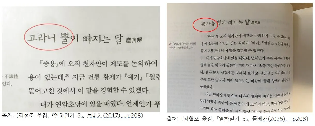 7. 윤규열이 김혈조 『열하일기』 1, 2, 3의 오역을 지적했지만 다시 읽어보니 한 곳 정도를 수정했다. 『열하일기 3』, 돌베개(2017), p208 고라니 뿔은 큰 사슴뿔로 고쳤다. 그래서 이번에 한문 원문과 번역본 여러 개를 함께 읽어 보려고 한다.
