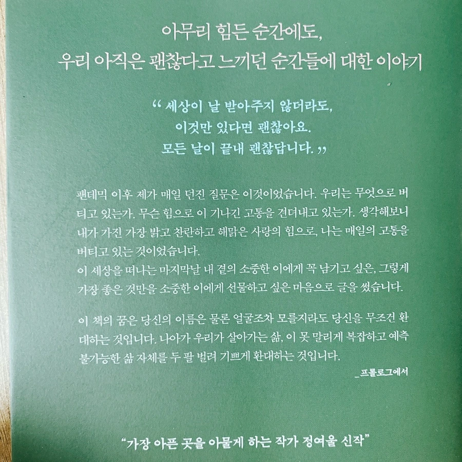 가눌 수 없는 슬픔이 매일 나를 공격해도, 내가 미처 다 이루지 못한 꿈들이 보이지 않는 화살이 되어 나의 심장을 찔러도, 나는 아직 괜찮다고 느끼는 순간들에 대한 이야기입니다."