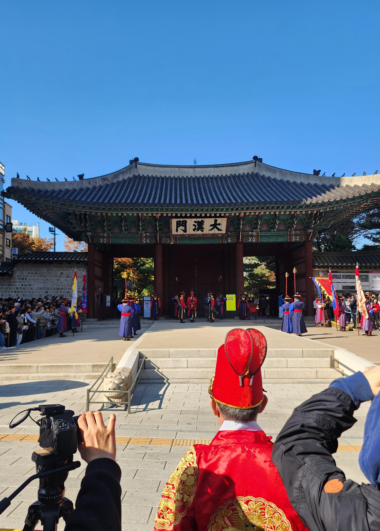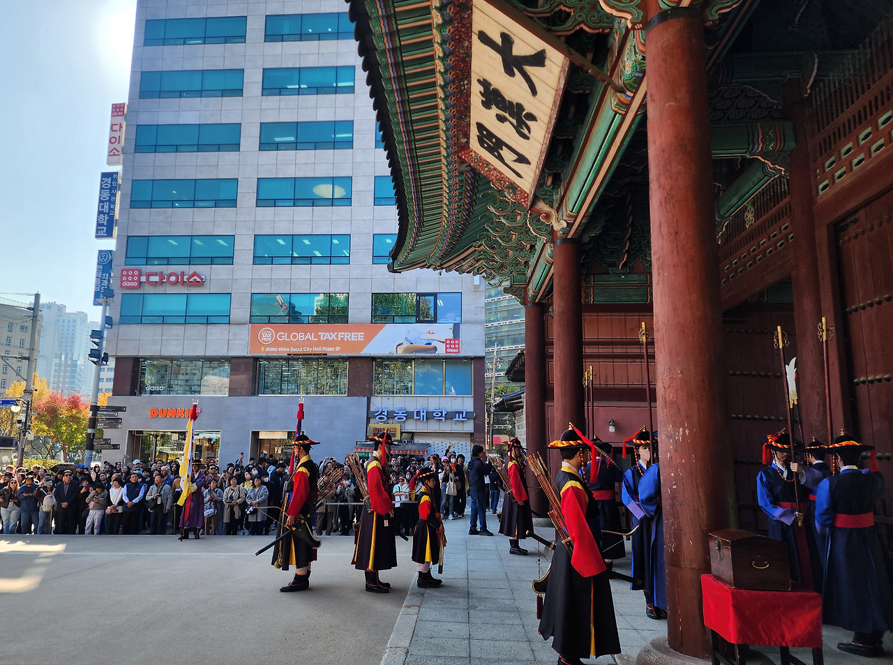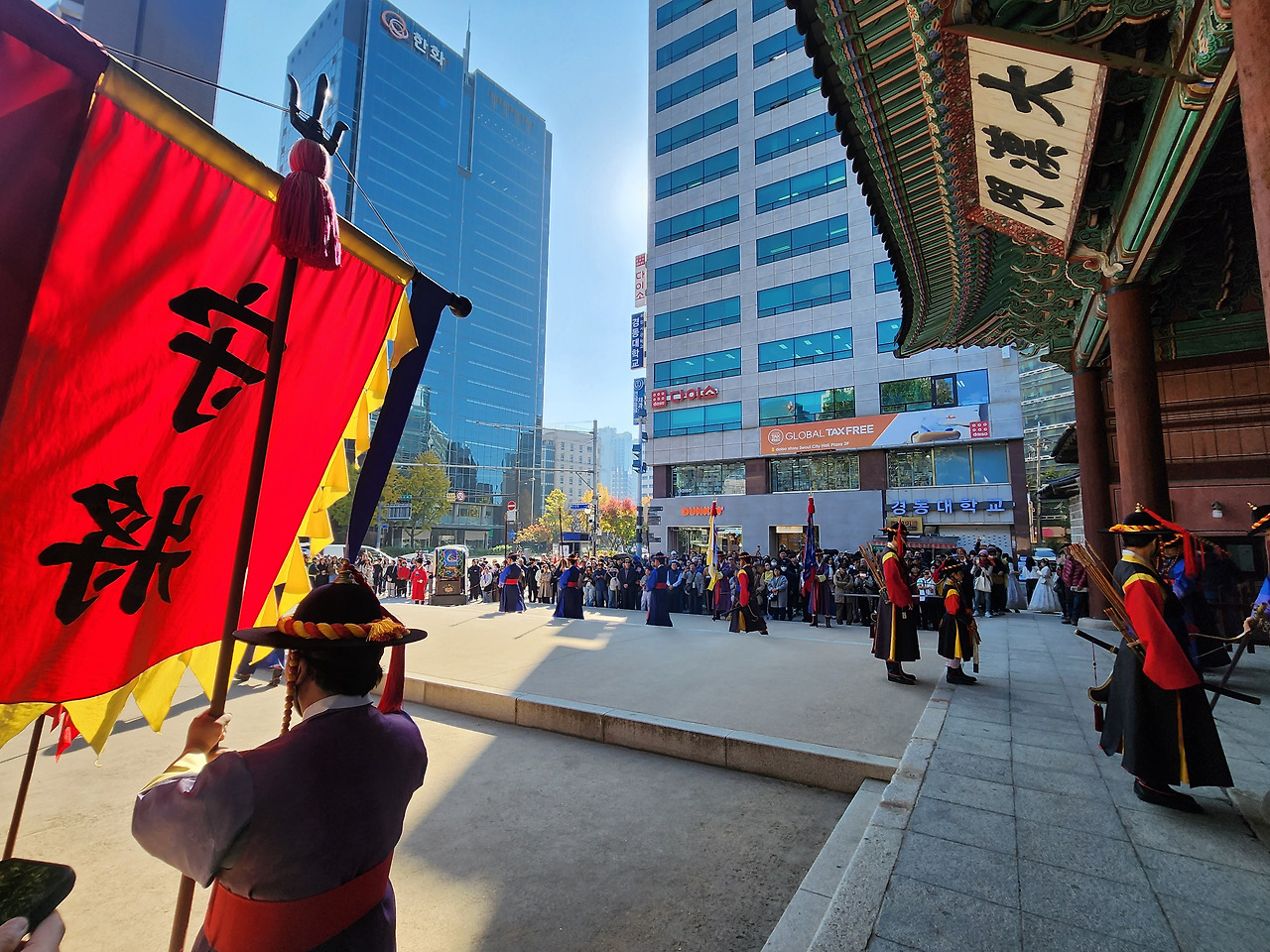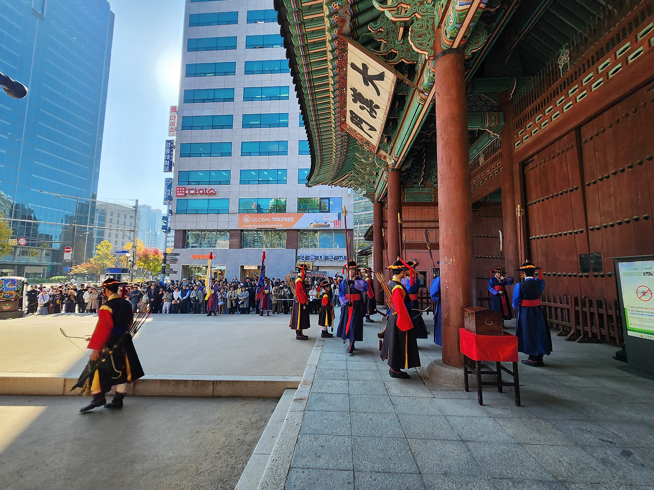 대한문 앞에 비잉 둘러싸인 행렬과 관광객들 사이로 왕궁 수문장 교대의식을 하는 것이 보인다. 어느새 11시가 지난 듯 개식 타고 와 군호하부, 수문장 교대의식이 차례로 이루어진다.