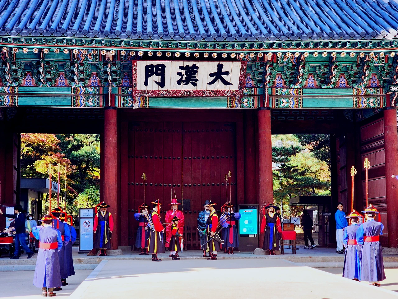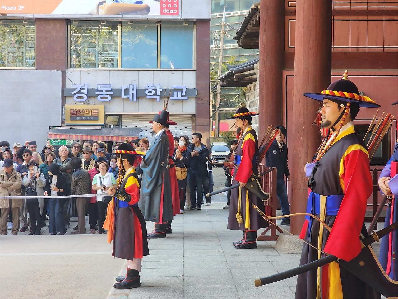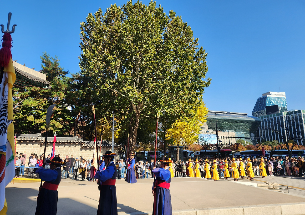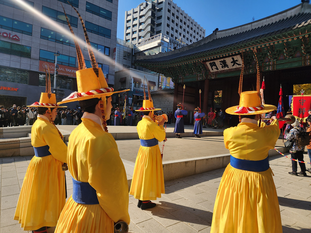 대한문 앞에 비잉 둘러싸인 행렬과 관광객들 사이로 왕궁 수문장 교대의식을 하는 것이 보인다. 어느새 11시가 지난 듯 개식 타고 와 군호하부, 수문장 교대의식이 차례로 이루어진다.