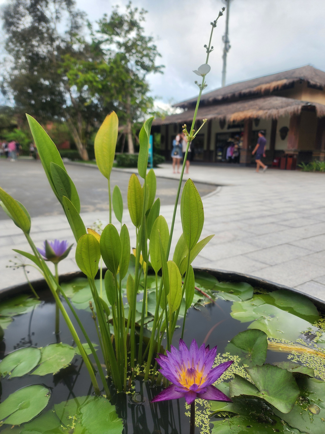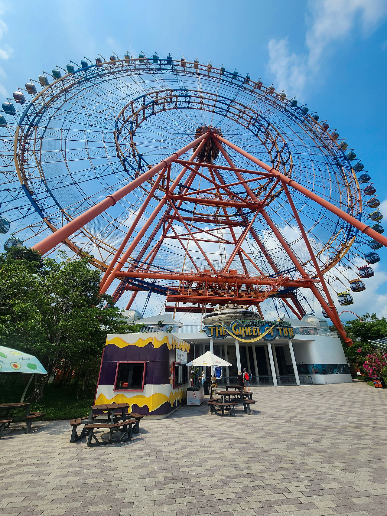 친구들을 설득해서 몇 가지 놀이기구 타는 일에 의기투합했다. 다이내믹한 것을 경험하고 싶었지만 공연히 욕심부리다 일정에 무리가 생기고 민폐가 될까 하여 속도가 느린 것으로 선택했다. 놀이기구를 타고 높은 곳에 오르니 멀리 바라다 보이는 풍경이 시원하다. 하늘과 맞닿은 산호색 바다와 녹지품에 안긴 테마파크가 볼수록 아름답다.