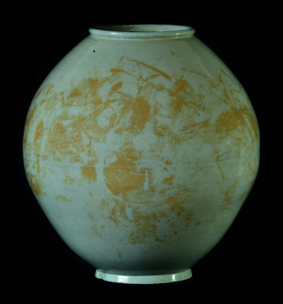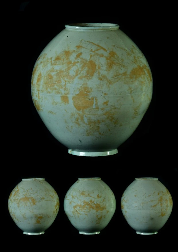 지금은 유약을 기계로 섞습니다. 골고루 섞이기 때문에 절대 요변이 나올 수가 없습니다. 조선시대에는 도공들이 직접 눈으로 보고 막대기로 저었습니다. 이 달항아리는 사람의 눈에는 잘 섞인 것 같은데, 덜 섞인 유약이 발려져서 구워진 것입니다. 가마에서 구워질 때 변화를 일으킨 것을 요변이라 이름 붙입니다. 백자 중에서 요변 자체가 희소하며, 특히 달항아리 중에서 유약요변을 일으킨 달항아리는 이 달항아리가 유일합니다.