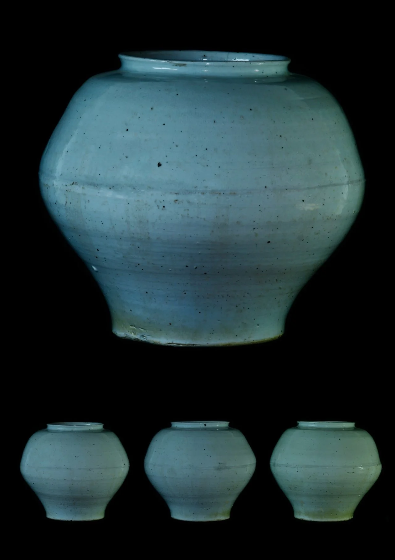 약간 푸른빛이 도는 유약이 입혀져 있습니다. 유약아래 자글자글 산재한 빙렬이 있어 초봄이나 늦가을에 구워졌으리라 추측됩니다. 가마온도와 바깥 기온이 차이가 심하면 빙렬이 생깁니다.