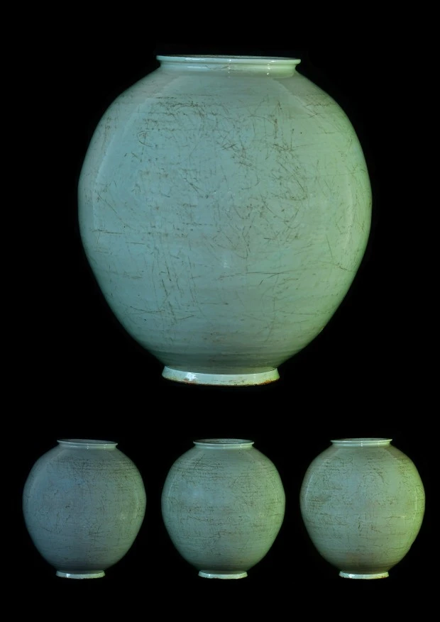 이 달항아리는 타원형 몸통에 유약이 골고루 두껍게 씌워져 반질반질 윤기가 흐릅니다. 높이 45.5cm, 몸체지름 41cm, 입지름 20cm, 밑지름 16cm로 지극히 안정감이 느껴집니다. 유약 아래에 초벌구이로 남은 물레자국과 손자국이 몸체 전반에 걸쳐 나타납니다.
