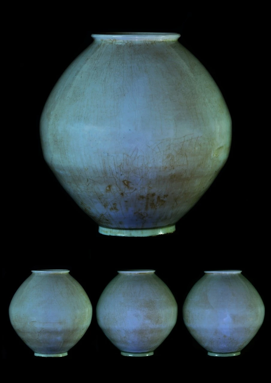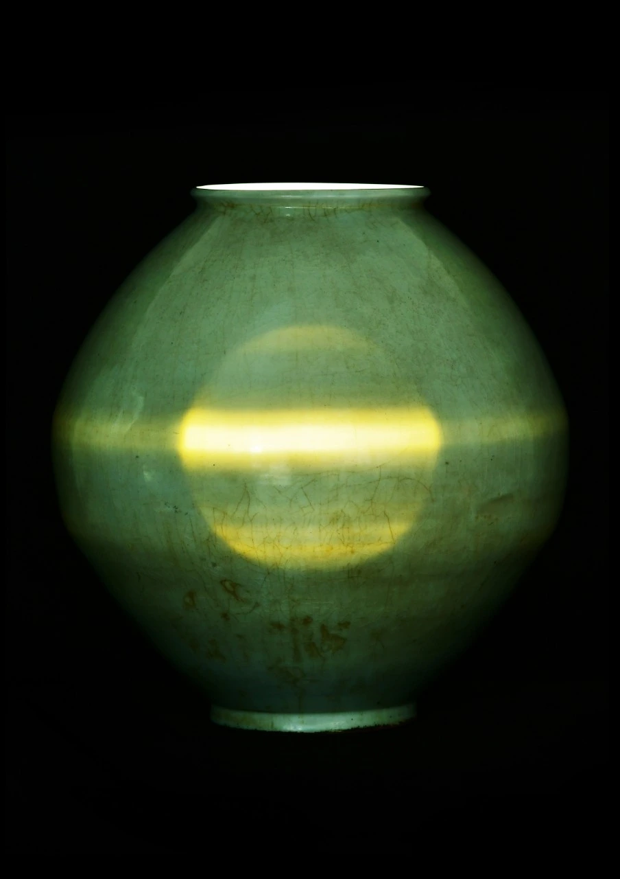 몸통 전반에 걸쳐 넓은 빙렬이 나타나며, 유약이 덜발린 굽 쪽에는 옹이를 닮은 기하학적 상처들이 자리하고 있습니다. 이 달항아리만의 대체 불가능한 특징이 있습니다. 바로 빛이 투과된다는 것입니다. 어떤 백토를 사용했는지 무척 궁금해지는 대목입니다.