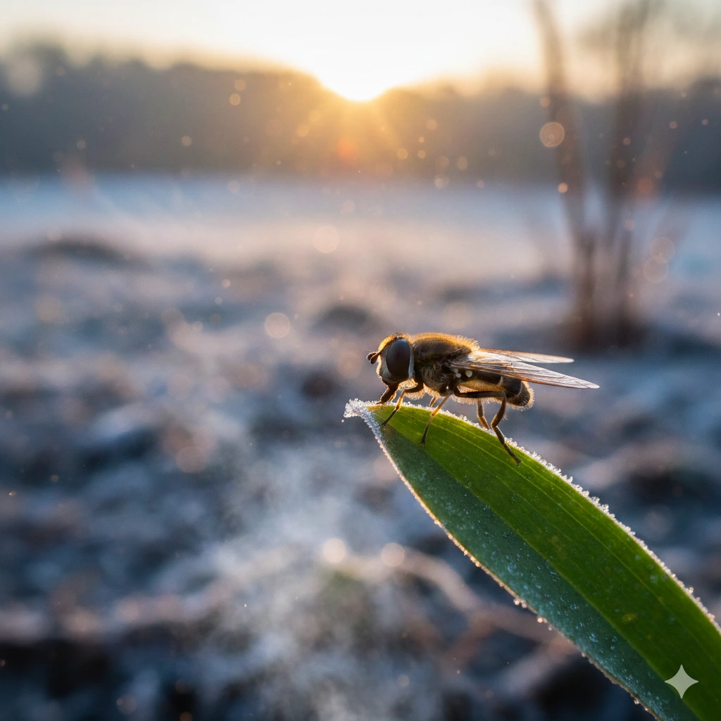 언제나 하나쯤은 먼저 모습을 드러낸다. 설날 아침, 아직 겨울의 잔기가 서슬 퍼렇게 남은 공기 속을 홀로 비집고 나오는 존재. 초록의 잎사귀 위, 금빛 햇살을 등에 업고 앉은 작은 꽃파리. 환영조차 준비되지 않은 시점에 가장 먼저 발을 디디는 가냘픈 날갯짓.