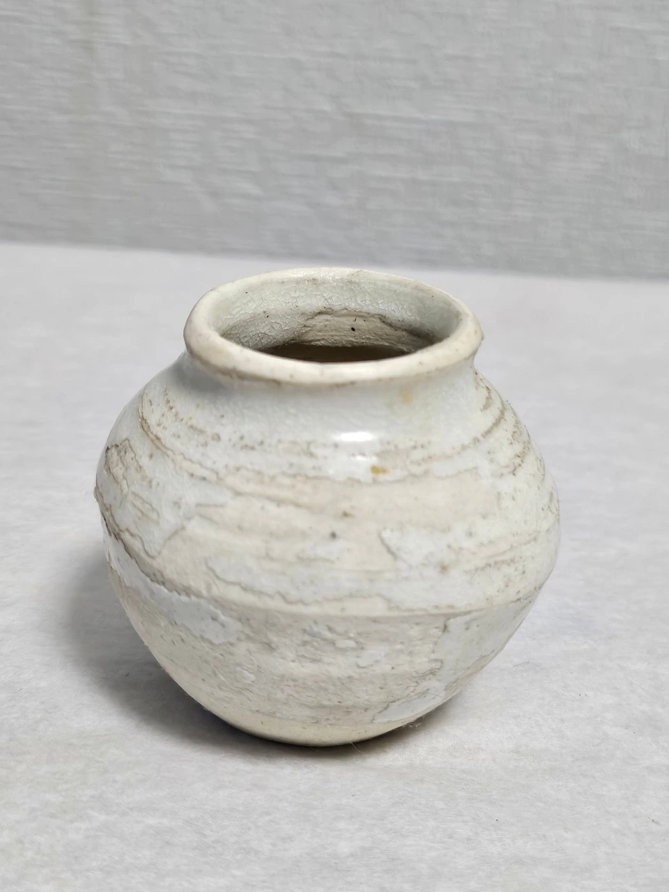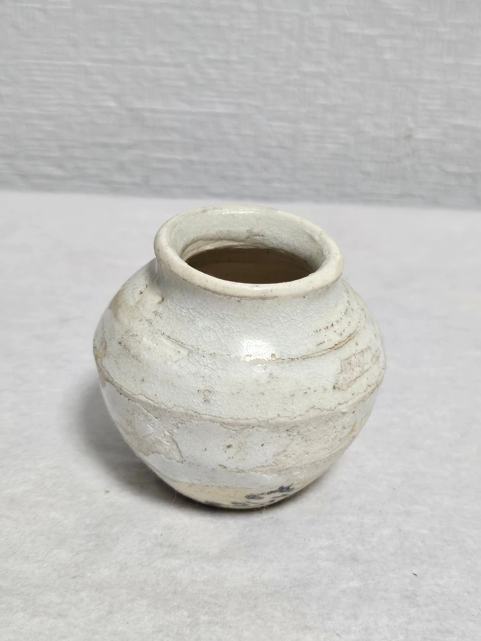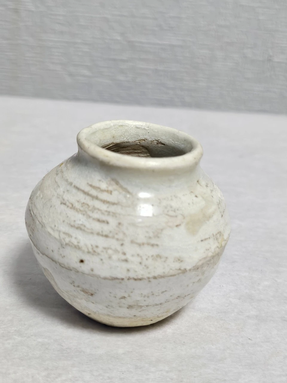 이러한 재건의 의지는 구체적인 공학적 팩트로 증명된다. 38cm 중호의 동체부 하단에 남은 뚜렷한 붓질의 흔적은 형식적으로는 분청사기의 귀얄 기법과 닮아 있으나, 그 내면은 전혀 다르다. 어두운 흙을 가리기 위함이 아니라, 이미 하얀 백토(White Clay) 바탕 위에 다시 정제된 백토 물을 입히는 이중 레이어(Double-layering) 공법을 택한 것이다. 이는 부족한 재료적 토대 위에서 백색의 순도를 물리적으로 끌어올려 조선 백자의 권위를 되찾으려 했던 도공의 사투가 담긴 공학적 설계다.