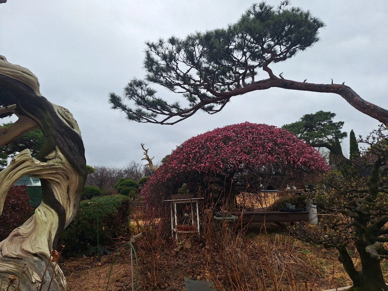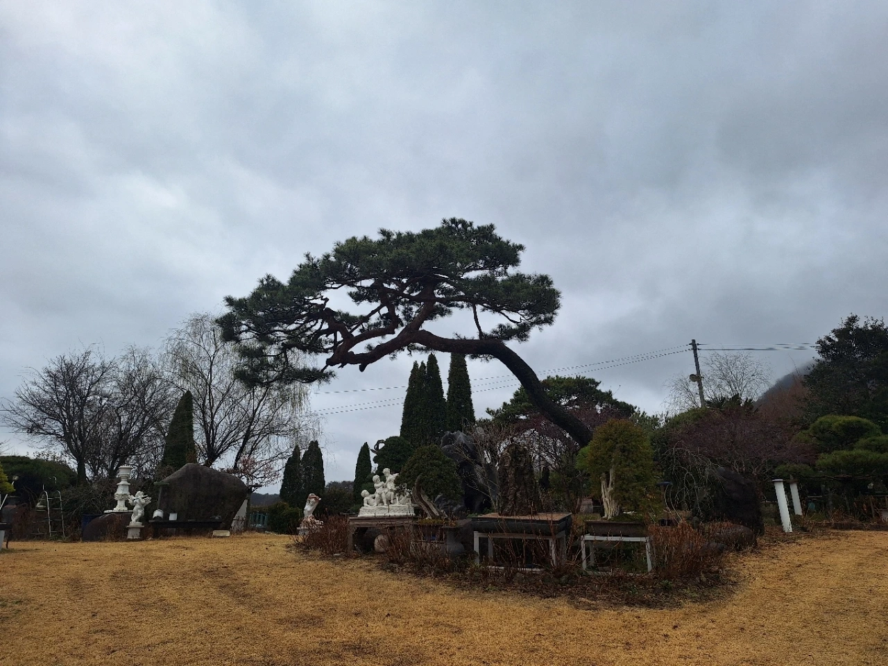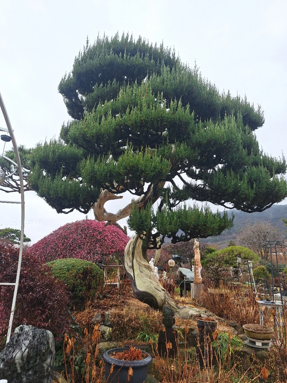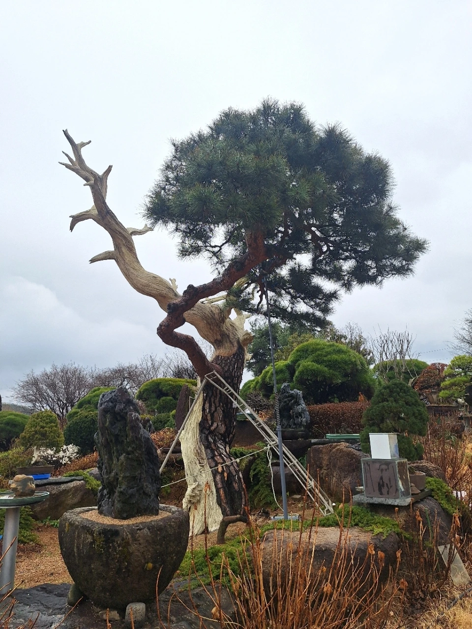 뒤편의 소나무는 오래 버텨온 몸이다.