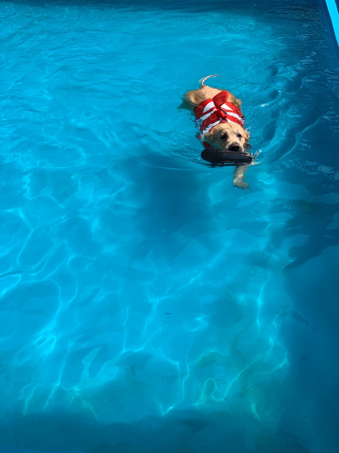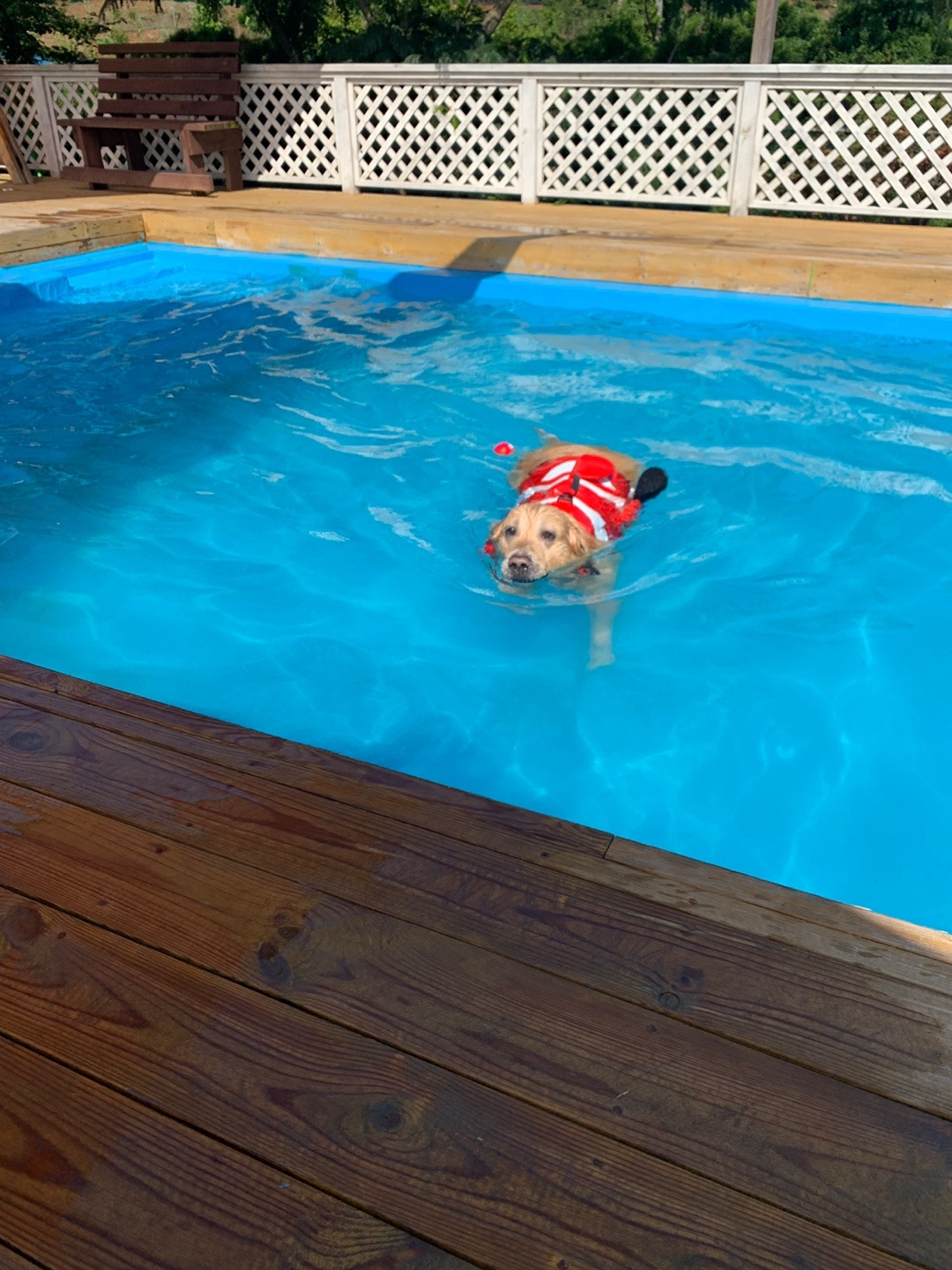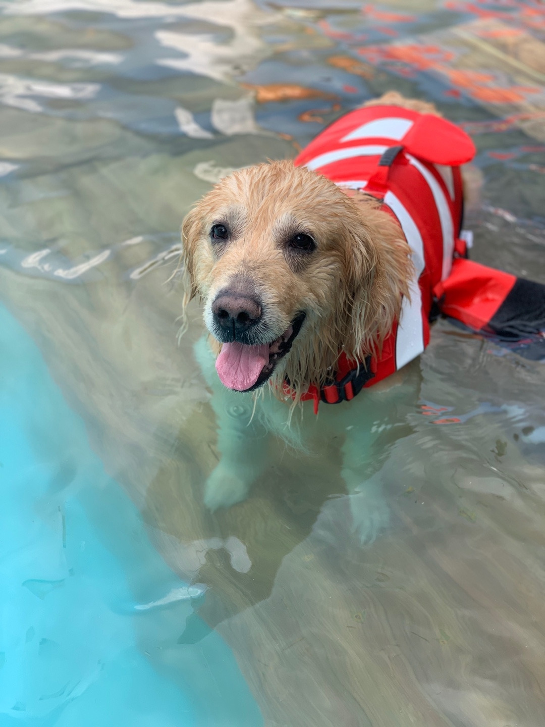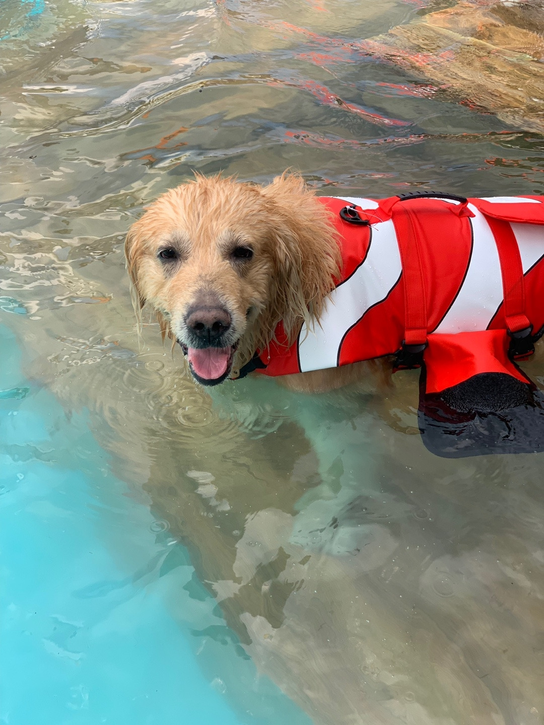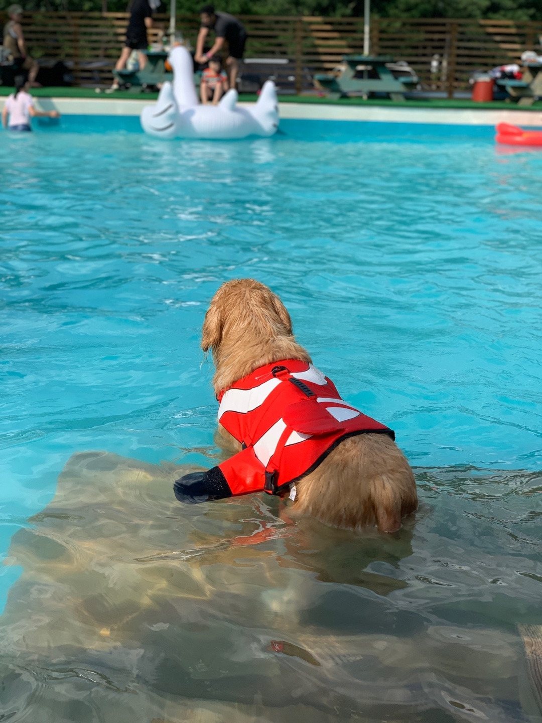 포는 수영을 참 잘했다. 딱히 가르치지도 않았는데..(라고 하면 좀 우습지만, 수영장에 가보면 수영에 익숙하지 않은 리트리버가 많다. 엄청 허우적대고 당황하고 있다.) 처음 수영장에 갔을 때에도 포는 저 혼자 물에 스윽 들어가 신나게 수영을 했다. 가끔 꼬리를 잡고 뒷다리 운동을 시키면, 힘껏! 물을 차는 게 느껴질 정도였다. 지금은 그 발길질이 많이 약해졌다. 이 날 수영하고 돌아오는 길에 생각했다. 구명조끼 하나 필요하겠구나...