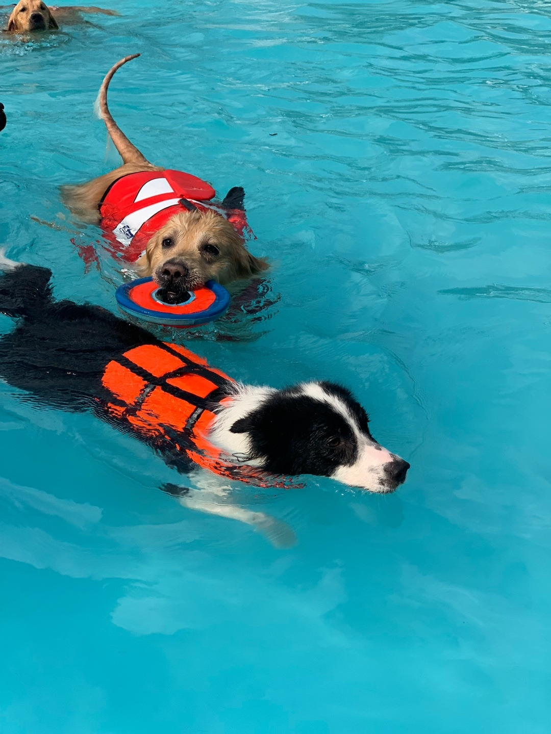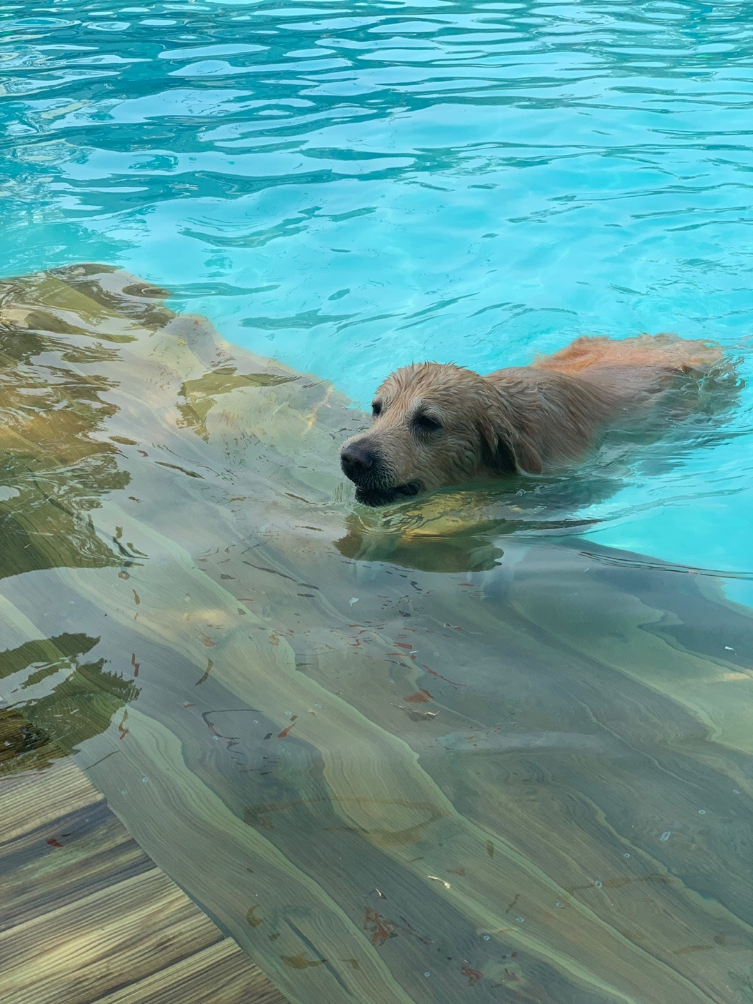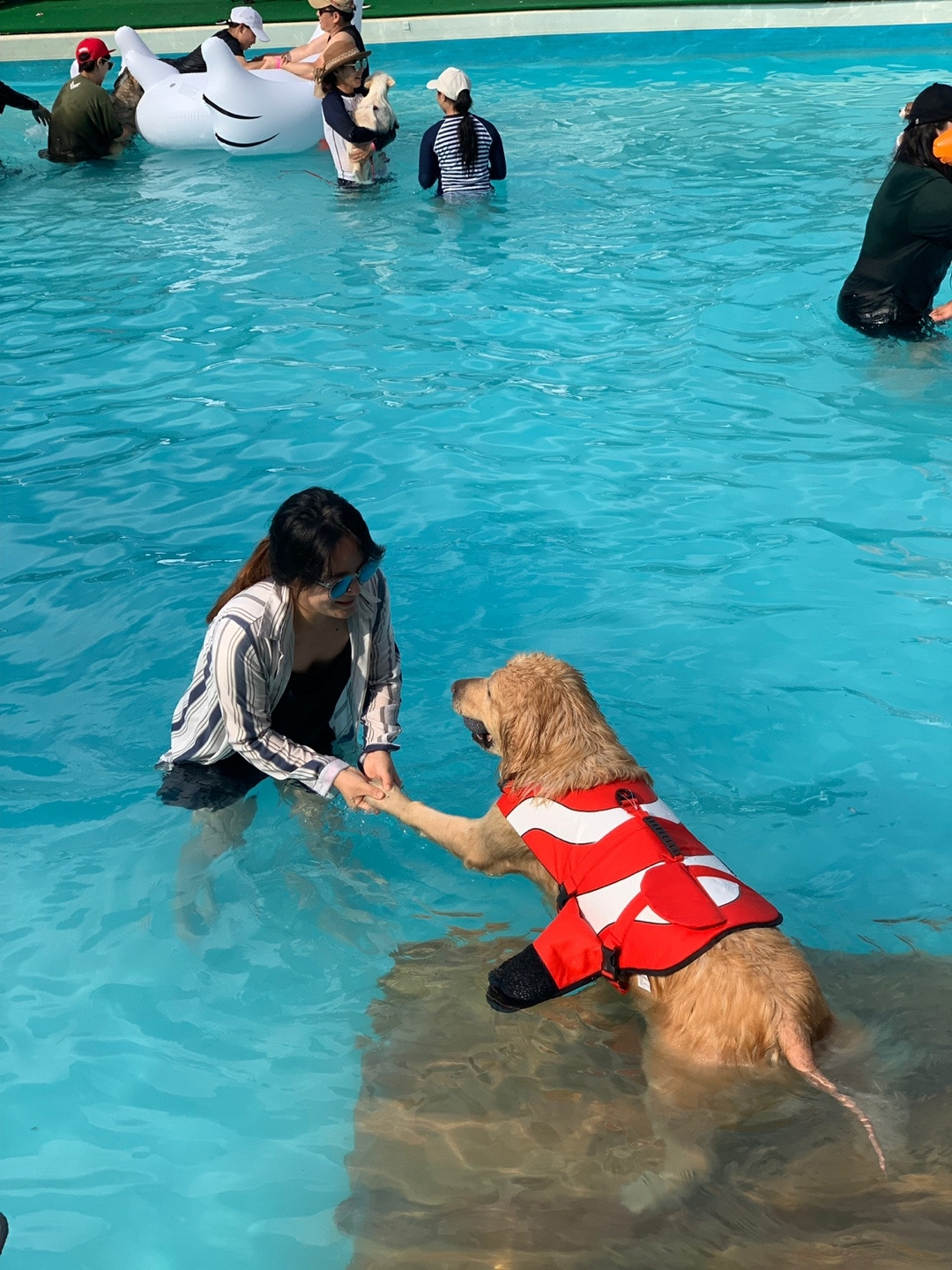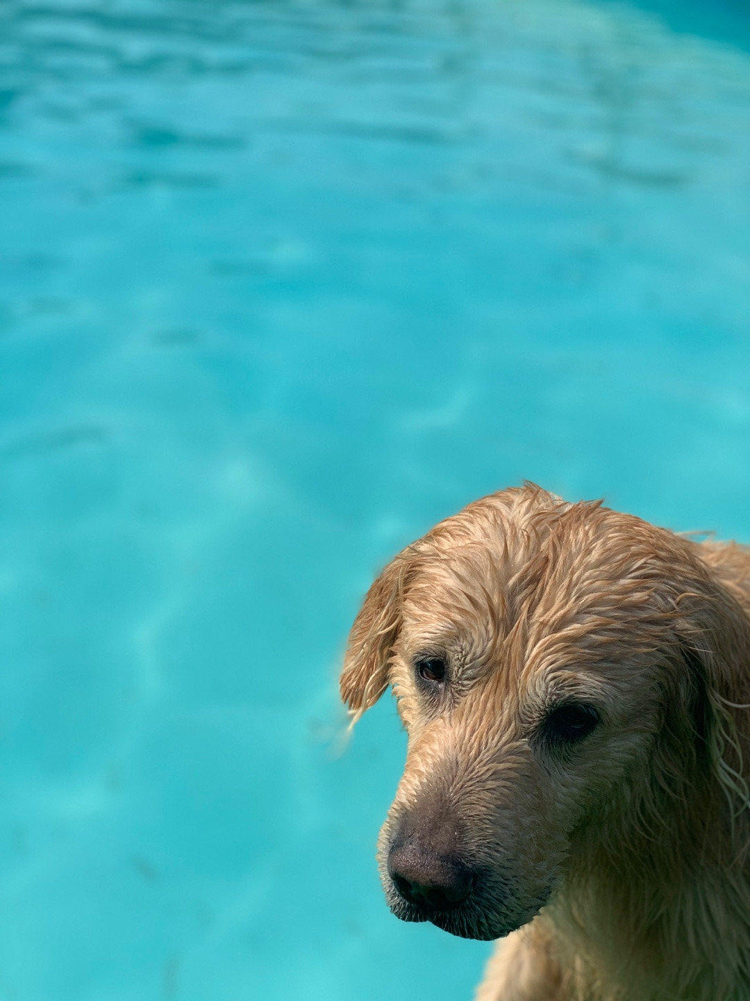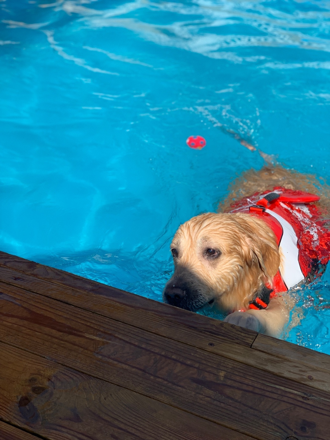 포는 수영을 참 잘했다. 딱히 가르치지도 않았는데..(라고 하면 좀 우습지만, 수영장에 가보면 수영에 익숙하지 않은 리트리버가 많다. 엄청 허우적대고 당황하고 있다.) 처음 수영장에 갔을 때에도 포는 저 혼자 물에 스윽 들어가 신나게 수영을 했다. 가끔 꼬리를 잡고 뒷다리 운동을 시키면, 힘껏! 물을 차는 게 느껴질 정도였다. 지금은 그 발길질이 많이 약해졌다. 이 날 수영하고 돌아오는 길에 생각했다. 구명조끼 하나 필요하겠구나...