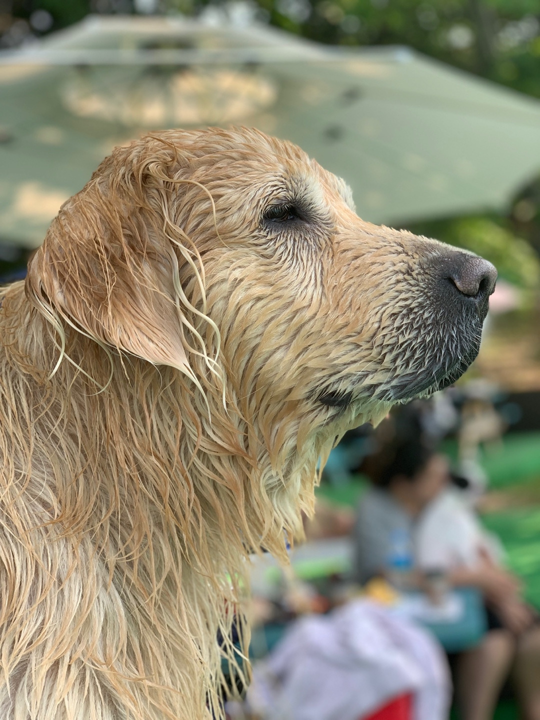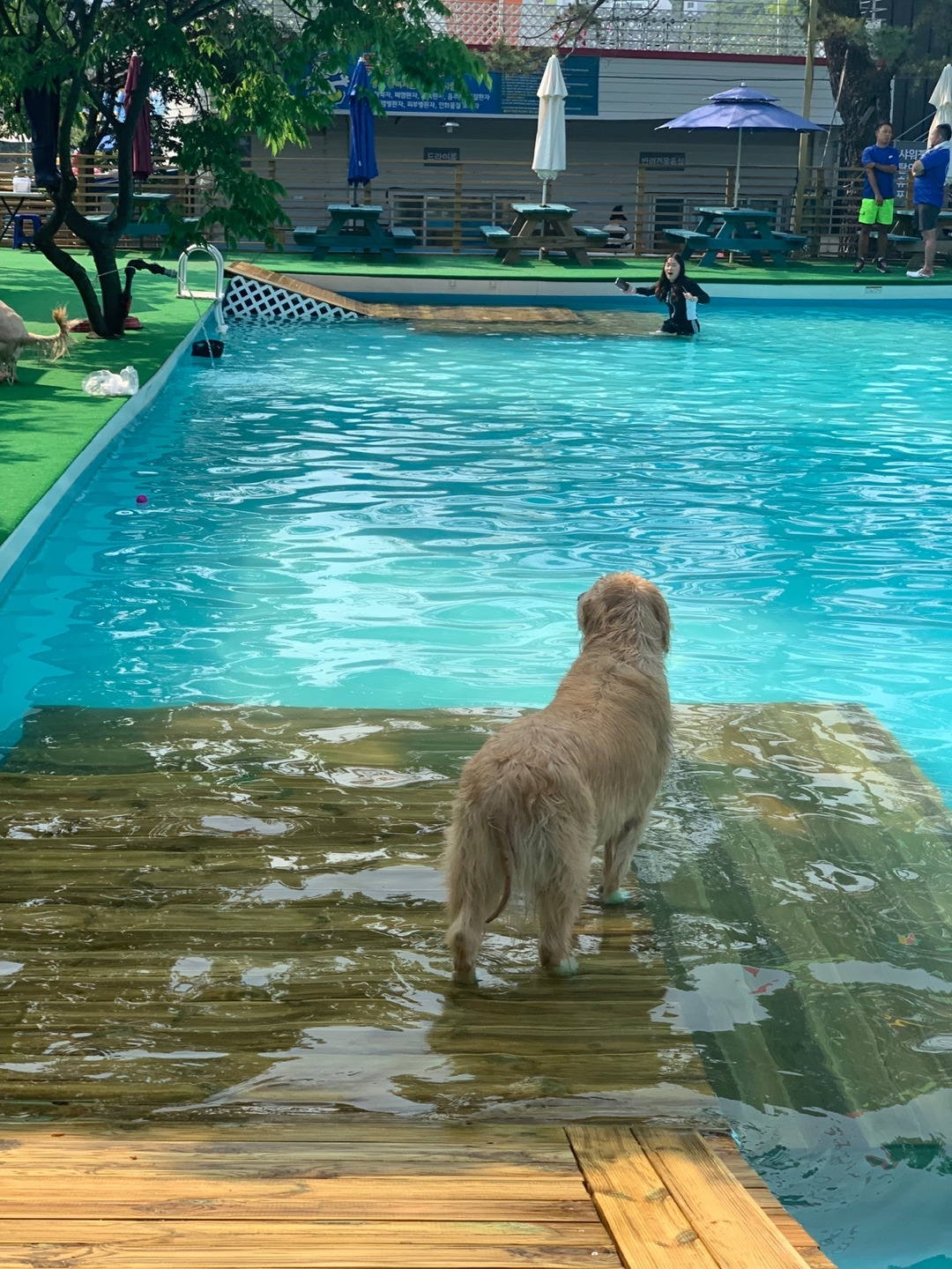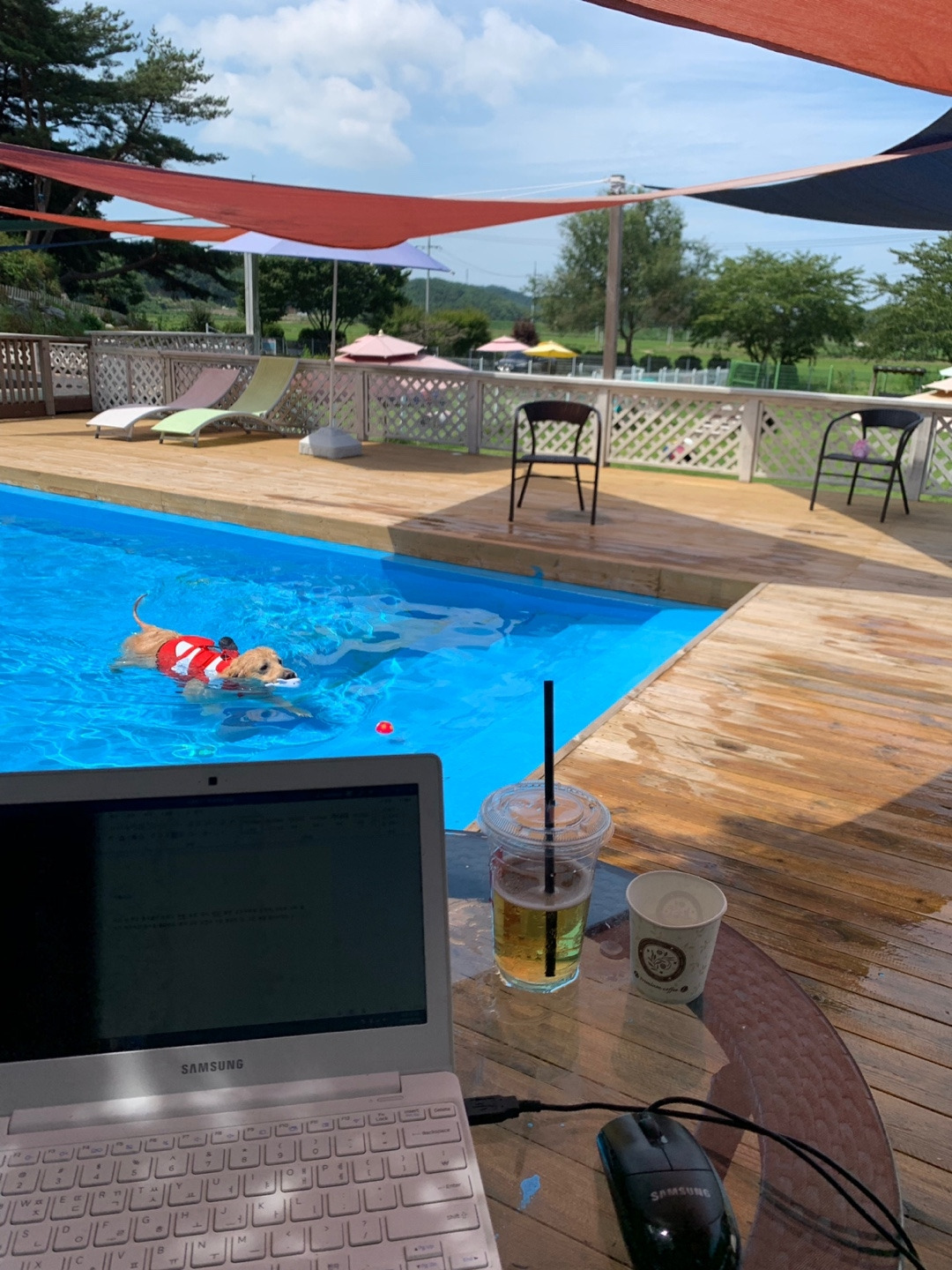 놀고 싶은 마음이 굴뚝같은데, 체력이 따라주지 않는 모양이다. 물속에 발만 담그고 다른 개가 노는 걸 지켜만 본다. 맘은 공을 물러 뛰어들고 싶은데 한참을 발만 담그고 첨벙 거리던 포였다. 한참을 그렇게 구경만 하던 포는 물밖로 나와 테이블에 앉아버렸다. 놀랐다. 작년까지만 해도 물속에서 5시간을 놀던 포였다. 좋아하는 고기도 마다하고, 간식도 마다하고, 쉴 때도 물속에서만 쉬던 포였다. 불쌍한 내 새끼. 늙어서 이제 체력이 달리나 보다.
