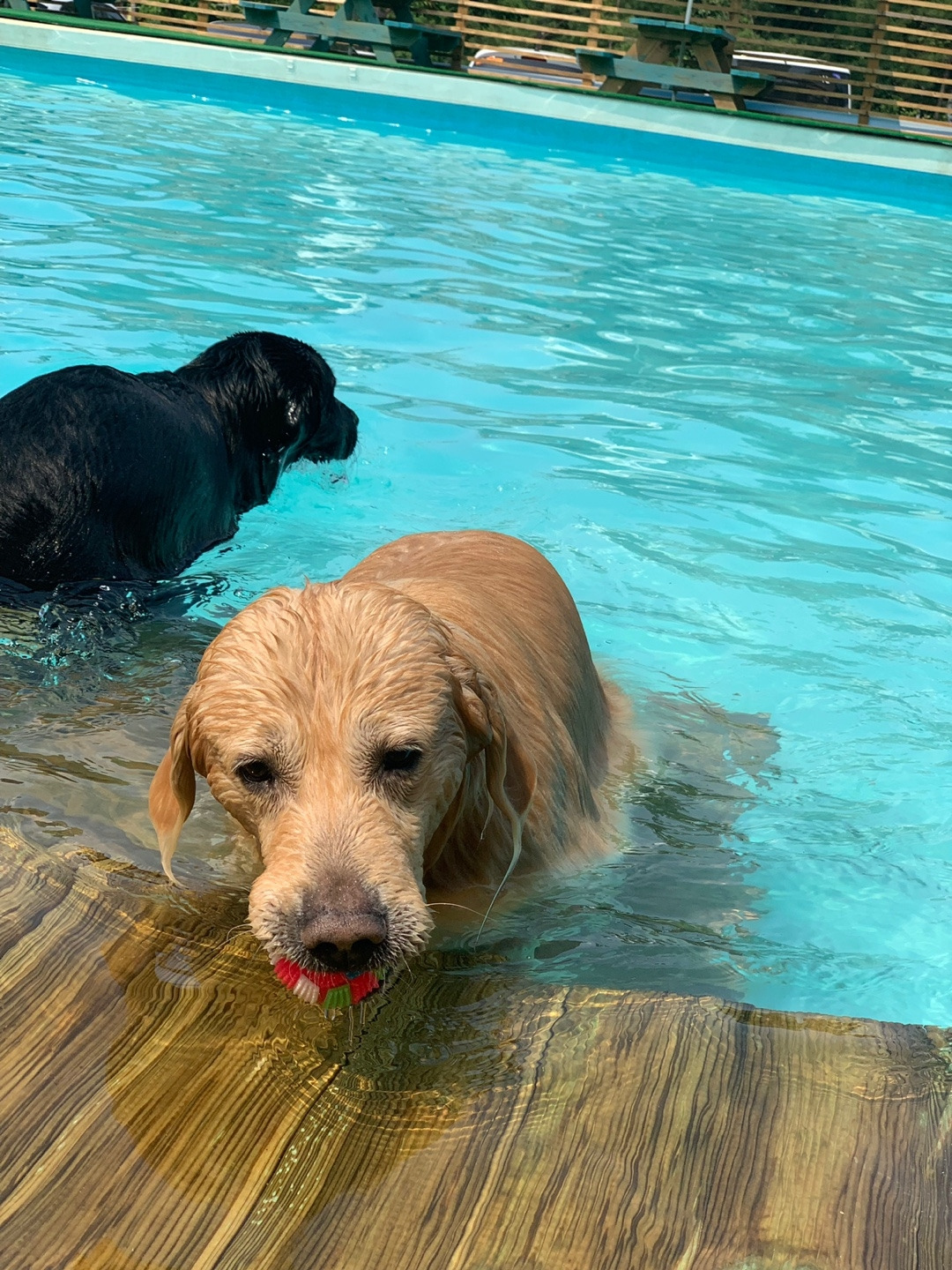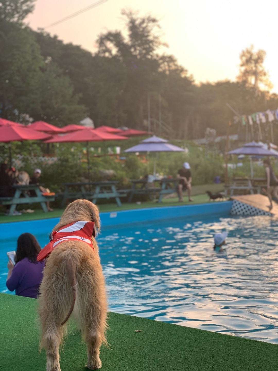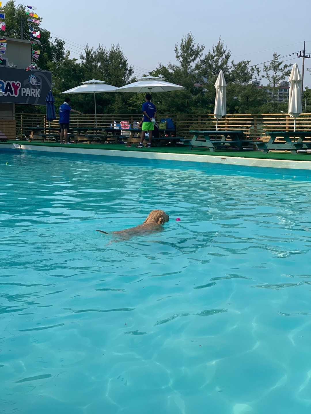 이 날은 오후 3시에 수영장에 도착해 9시가 다 되어서야 나왔다. 대략 6시간 동안 물 밖에 나와 있던 시간은 30분? 지난번 방문과 다른 모습이었다. 힘들어서 숨을 컥컥 쉬면서도 다른 강아지의 공을 쫓아 물로 뛰어드는 멍멍이포. 구명조끼가 이렇게까지 효과가 좋을 줄 몰랐다. 물트리버니까, 리트리버들은 다 수영도 잘하고 물도 좋아하니까 구명조끼 같은 건 필요 없다고 생각했다. 우리 포는 잘하니까.. 포가 나이가 들어간다는 걸 하나씩 느끼면서도 나는 이 걸 왜 생각하지 못했을까. 나이 들어가는 개를 키우는 게 처음이라 여러모로 서툴다. 신나서 공을 삑삑거리는 포 뒤에서 생각했다.