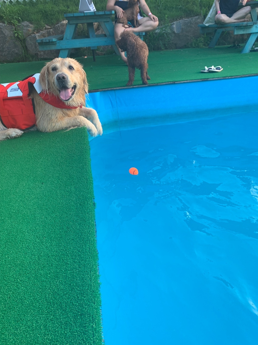원래부터 똑똑한 건 알고 있었는데, 9살이 될 때까지 혼자 노는 모습은 처음 봤다. 수영장 물이 나오는 곳에 공을 툭 떨어뜨리면, 공이 물살 따라 멀리 가고, 그럼 포가 뛰어들어 공을 물었다.