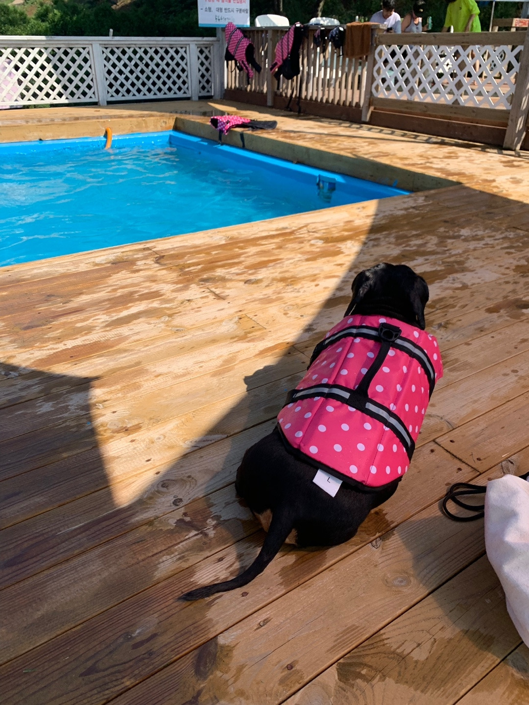 여름휴가도 함께 간 똘순이는, 수영이 싫은 모양이다. 저 큰 궁뎅이가 너무 귀엽다.