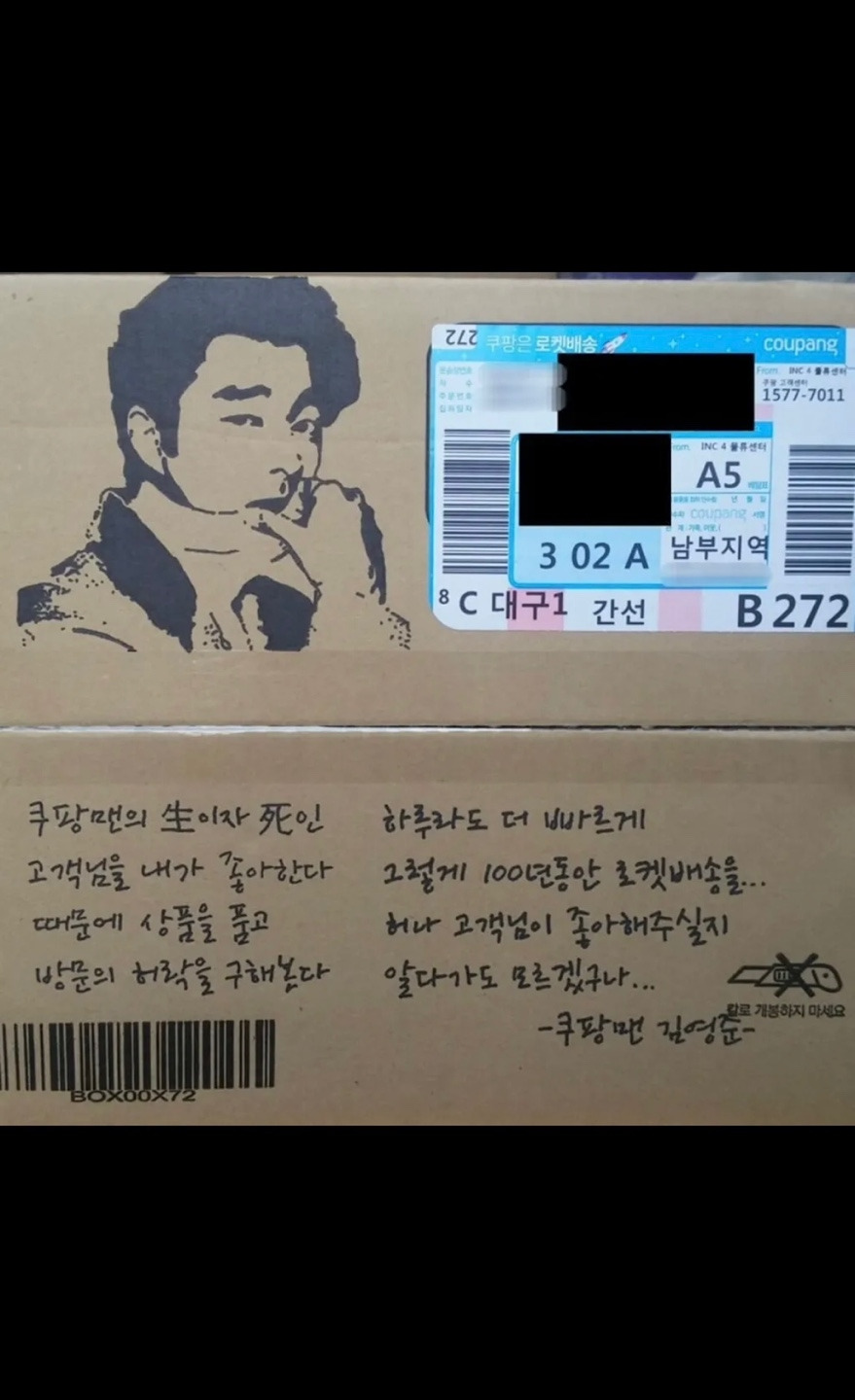 유튜브에서 택배기사들이 택배 상자에 그린 현란한 그림 모음을 봤다. 웹툰작가나 전업 화가 못지않은 솜씨들이다. 댓글에는 택배 경험이 있는 사람들인지 예전 일일 거라고 전에는 택배사에 모여 앉아 상자에 그리고 쓰곤 했었다는 이도 있고, 요즘에는 물량이 많아 상상도 못 한다는 반응도 있었다.