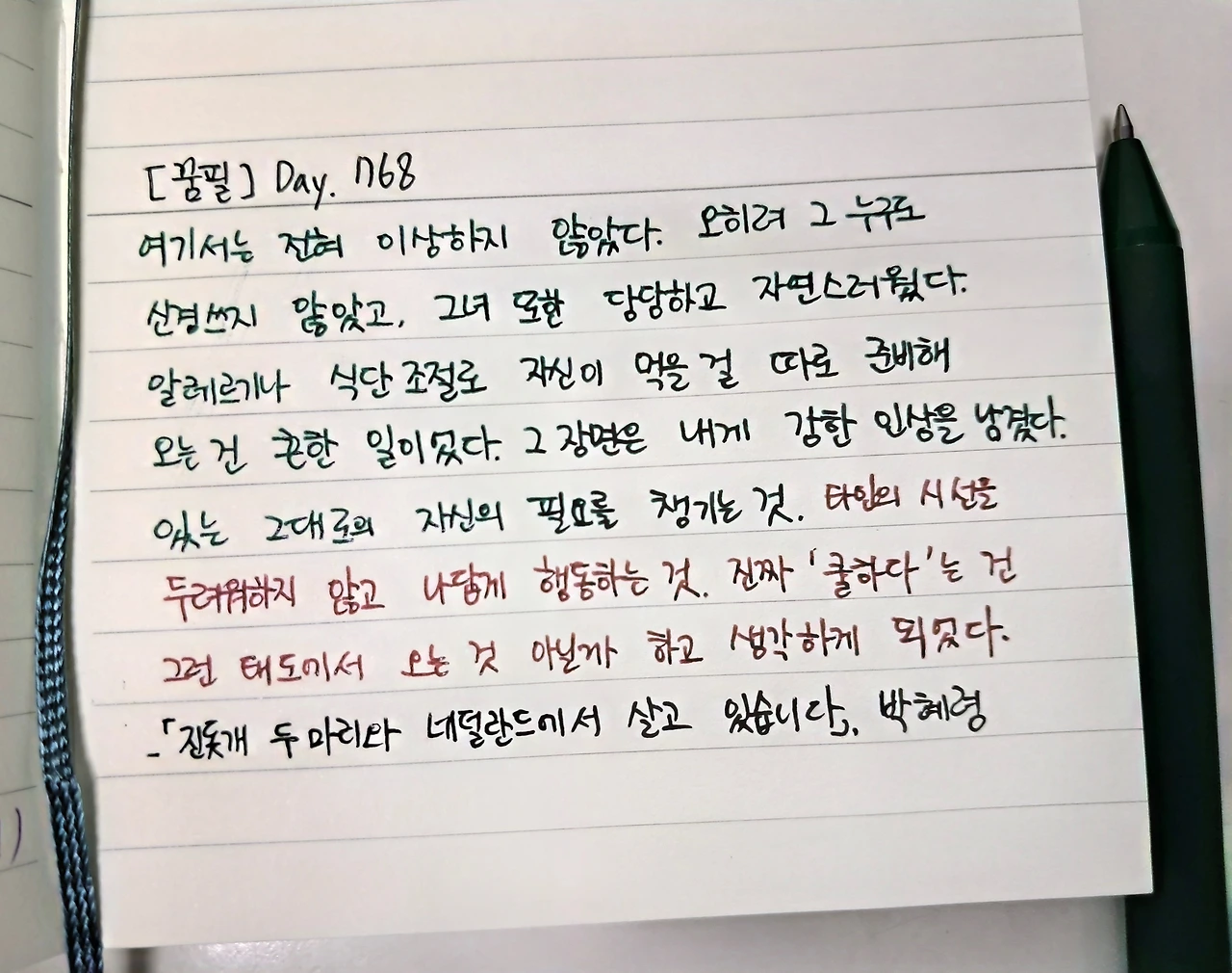 있는 그대로의 자신의 필요를 챙기는 것. 타인의 시선을 두려워하지 않고 나답게 행동하는 것, 진짜 '쿨하다'는 건 그런 태도에서 오는 것 아닐까 하고 생각하게 되었다.