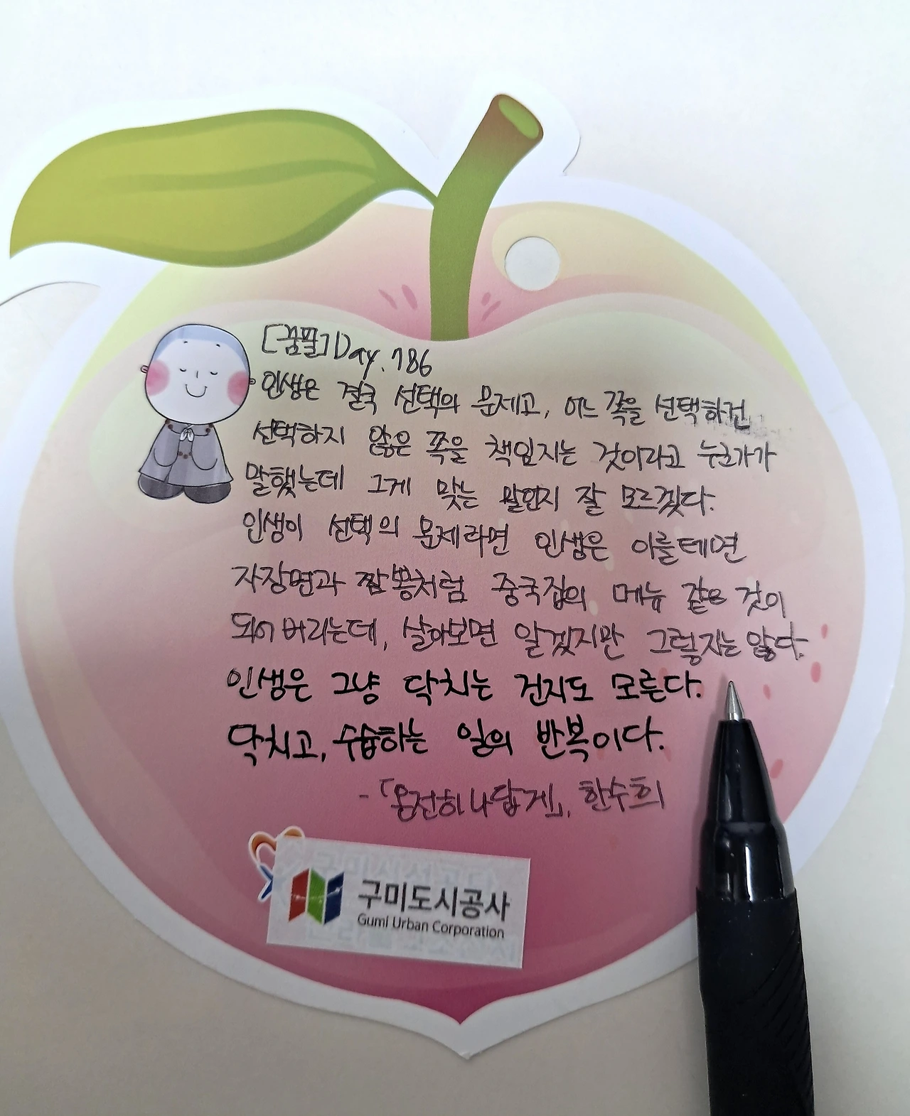그래서 오늘 필사한 문장을 읽고 고개를 끄덕였다. 작가의 말처럼 인생은 자장면이냐 짬뽕이냐 고르는 일처럼 정돈된 선택의 연속이 아니니까. 육아는 특히 더 그렇다. 아이들을 키우면서 ‘무엇을 선택할까’보다 ‘이미 벌어진 이 상황을 어떻게 수습할까’를 훨씬 더 자주 고민하는 것 같다.
